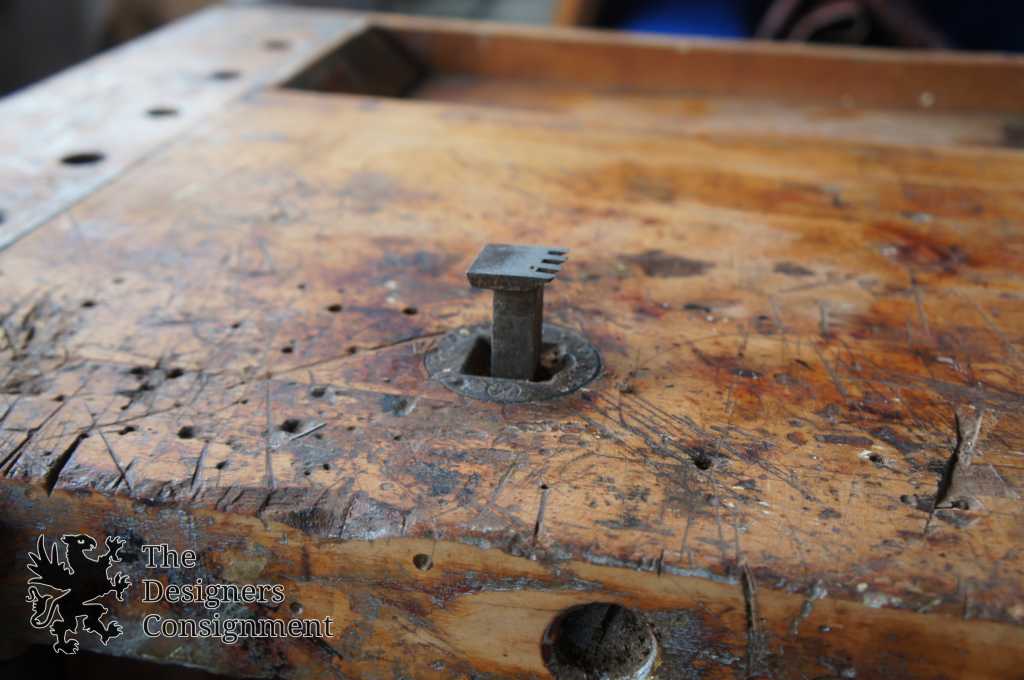 Up for consideration is a unique vintage tool bench. Features a central drawer, vice and planing stop. The back has a tray area for miscellaneous parts in addition to the holes for tools. A great piece for any setting.