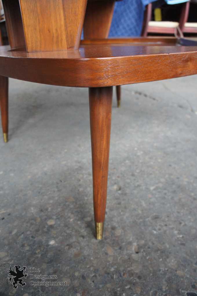 Iconic mid century modern styling by Gordons Inc. Circa 1950s. Features a tiered top and tapered legs with brass caps. The main surface has an inlet with a geometric design. Made from Mahogany. The perfect accent or addition to any corner space.
