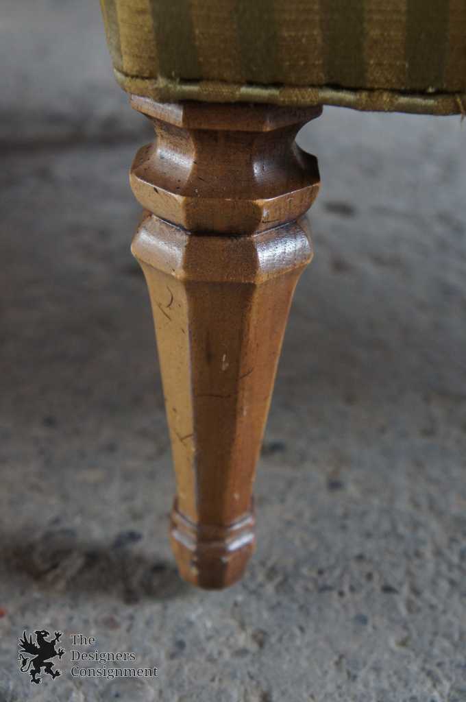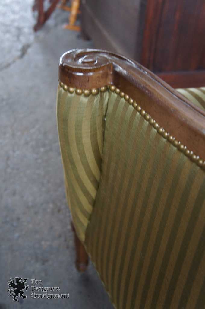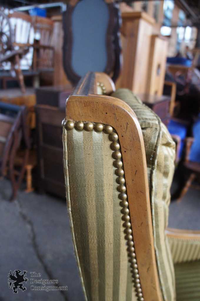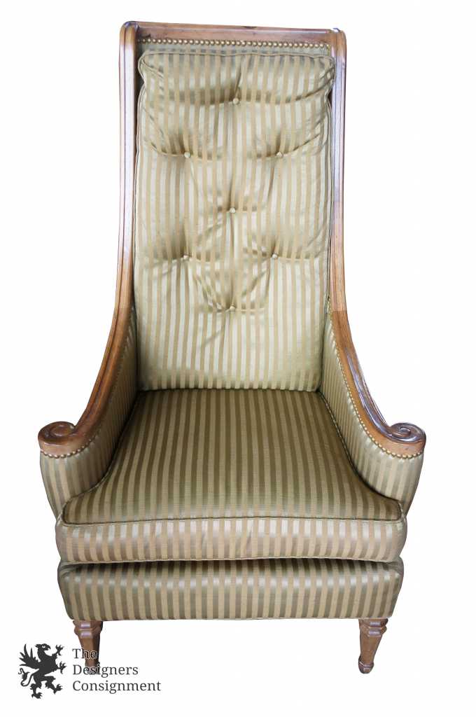 A beautiful and very comfortable mid century high back chair. Circa 1950-60s. The finish is a distressed pecan. Features a removable seat cushion and tufted back. The wood is framed in a brass nail-head trim that leads to scrolled arms. Front legs are tapered while back is of saber design.