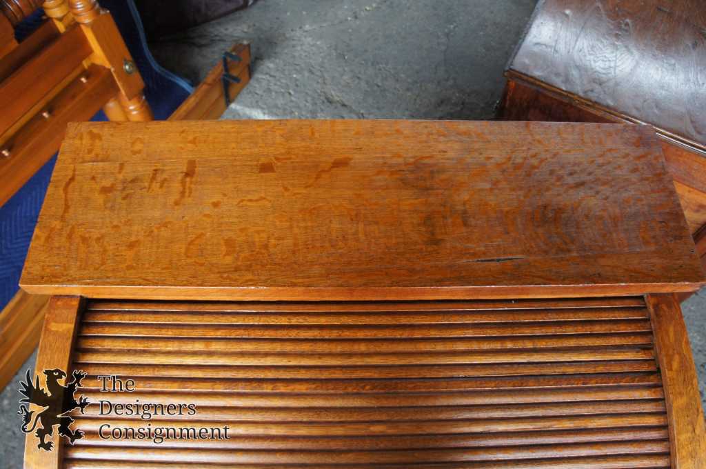 Up for consideration is a neat child size roll top desk. Made from Quartersawn Oak. A Half Cylinder design with interior storage. The lower portion features a foot rest, 4 drawers and a pull out writing surface. A neat addition to any space.
