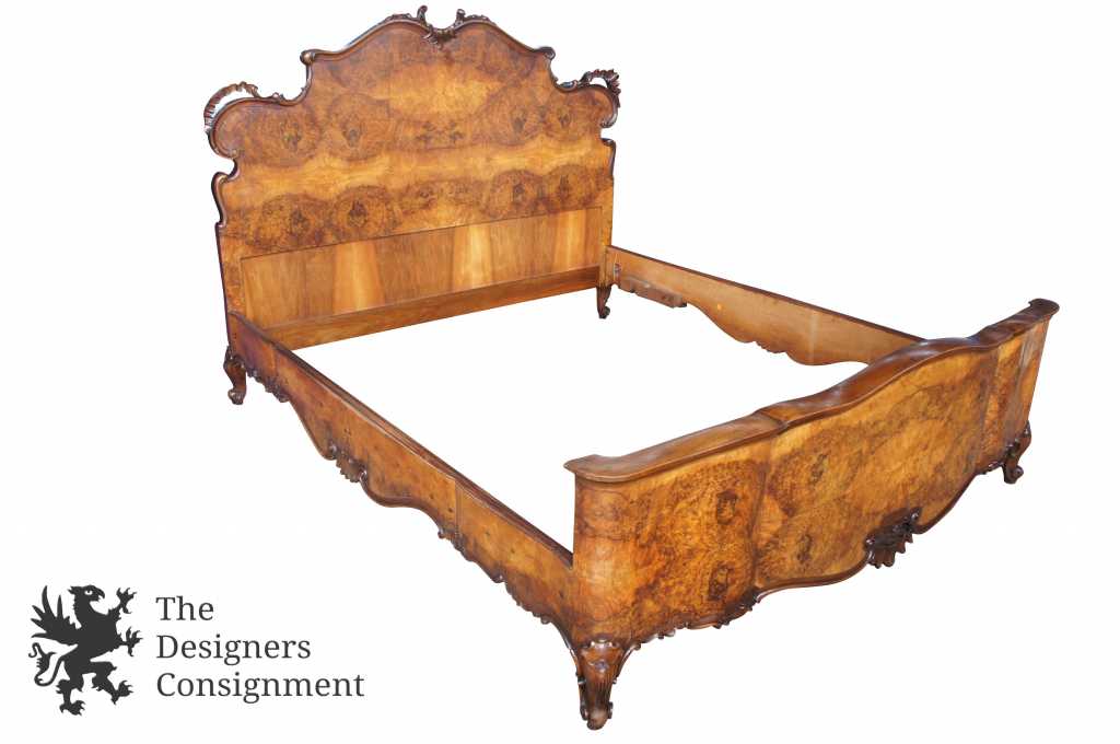 Up for consideration is a monumental Walnut burl-wood bed frame. Circa 1850s. The veneer is match-booked giving off gorgeous tones. Baroque style with scallop carved accents. This bed are Imported from Italy in the 1990s. Original purchase tag available.