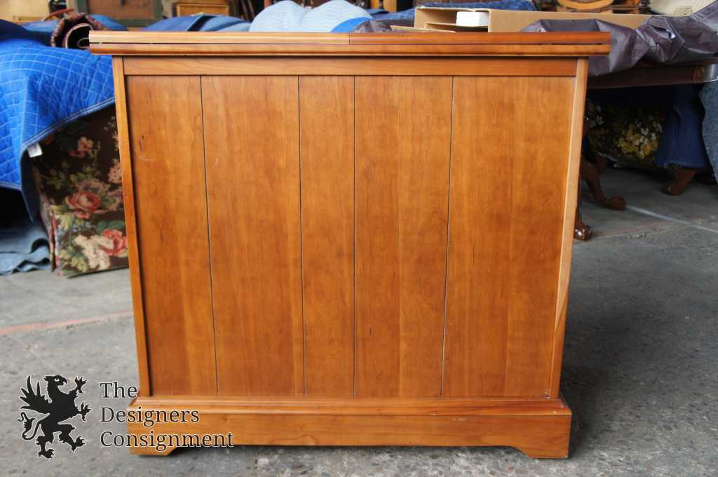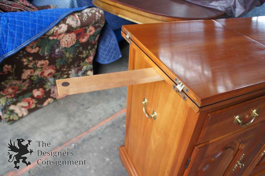 Features an expandable top, central drawer and lower cabinet portion. The piece is on wheels for ease of movement. The back of the piece is finished, allowing it to be displayed away from the wall.