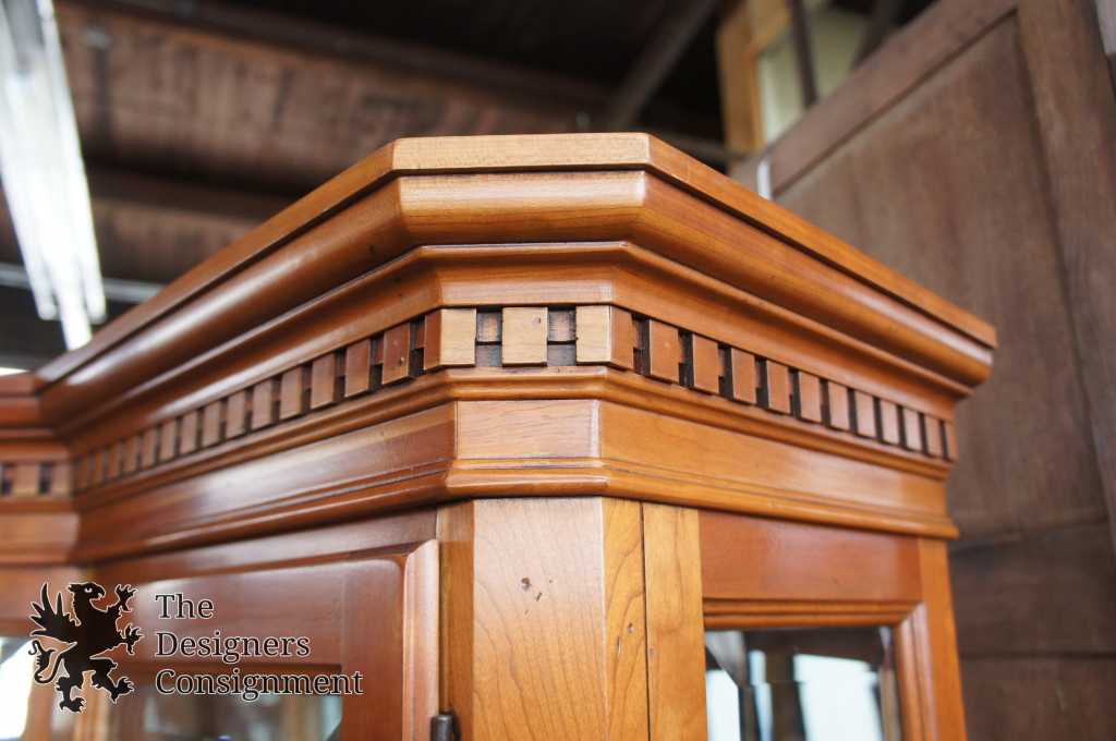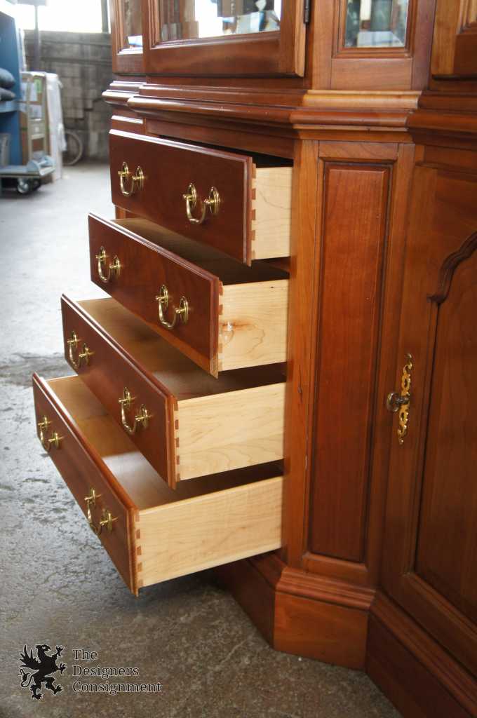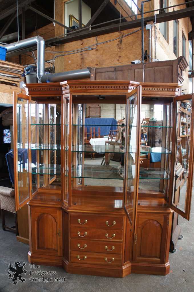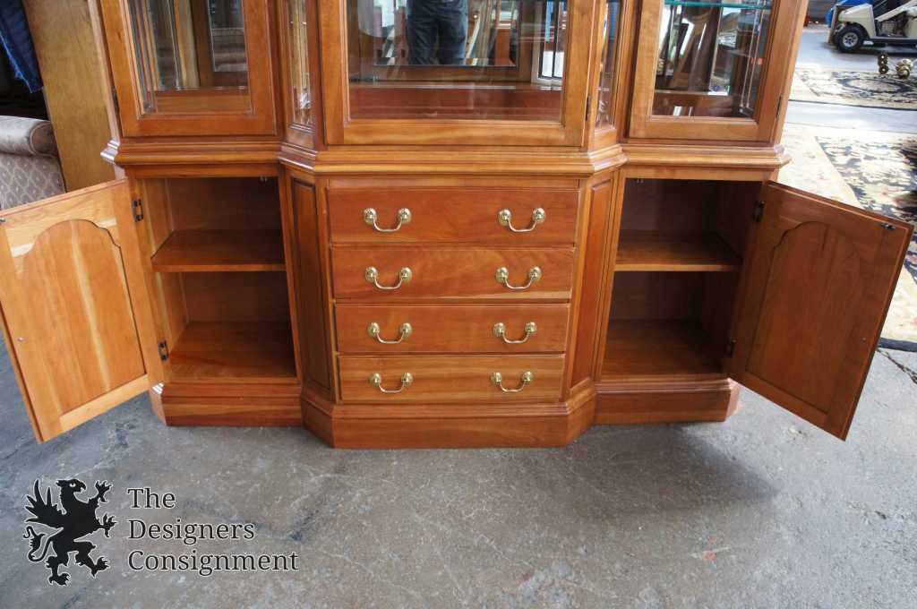 A beautiful breakfront by Harden Furniture. Made from Solid Cherry in their Champagne distressed finish. Circa 1995. Chippendale styling with beveled glass, a mirrored back and illuminated interior. There are 3 thick glass shelves for each section of the cabinet with plate grooves along the rear. Lower portion of the cabinet features 4 centrally located drawers flanked by outer cabinets. The top drawer has a silverware cloth as seen in the photos. The perfect piece for any setting.