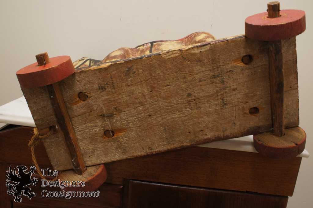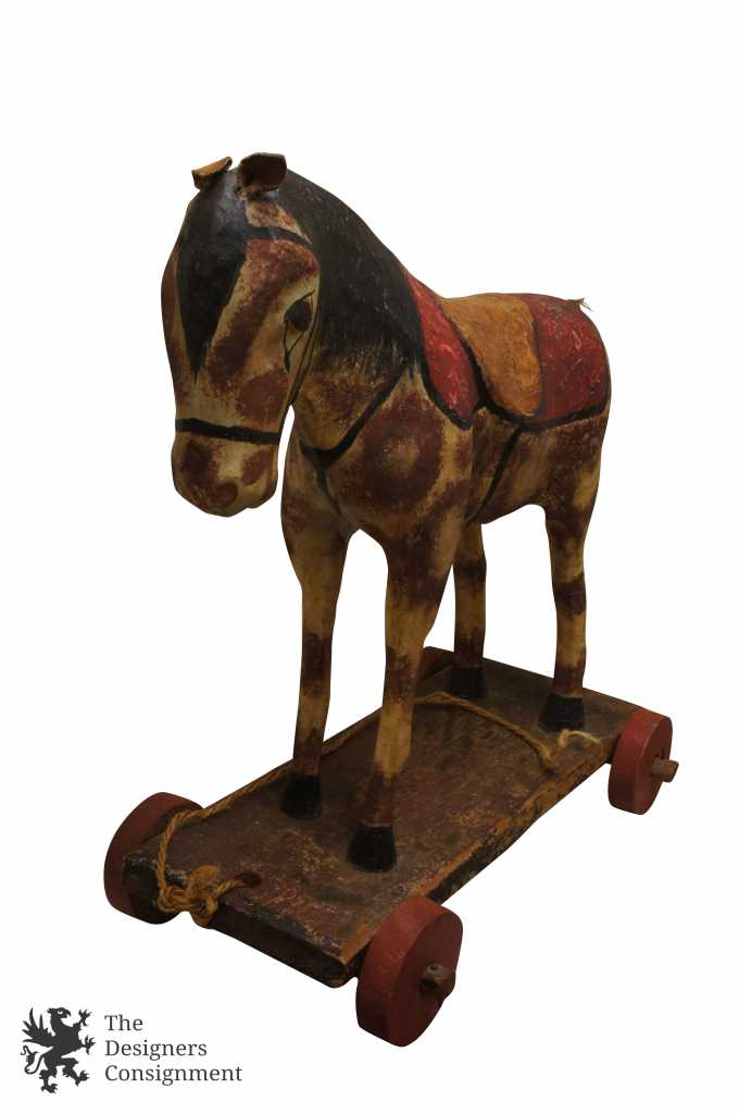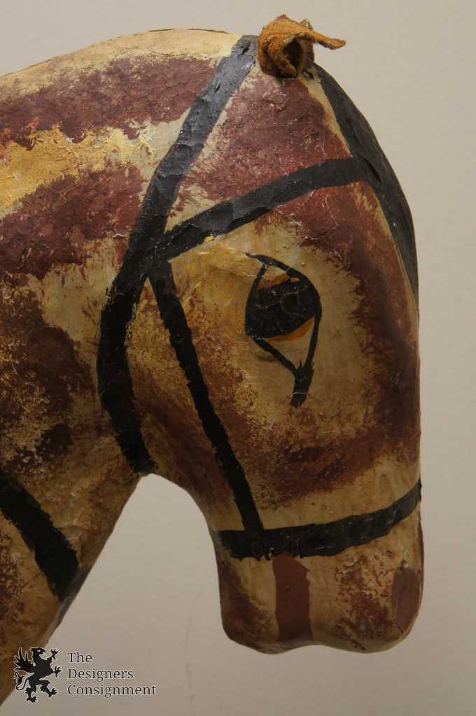 Up for consideration is a rare antique Papier Mache pull toy. Generally these horses are around 12" long, yet this one is close to double that size. Meticulously detailed down to the leather ears, paint and tail. Circa 1880-1920s. The horse is mounted on a wooden base. The wheels are still functional. A neat addition to any collection.