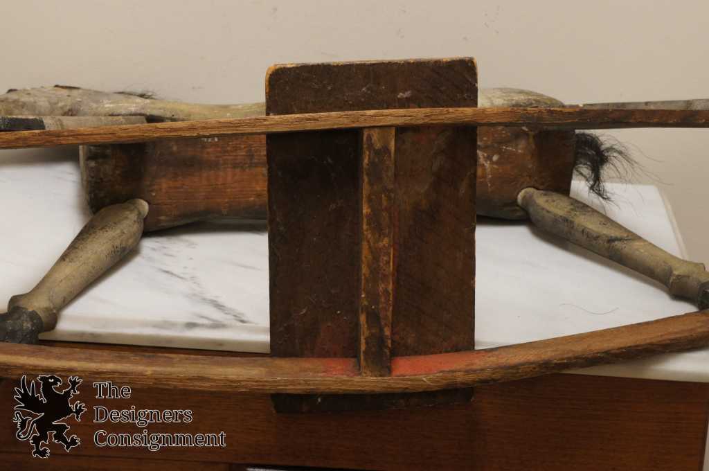 A beautiful late 19th century handmade rocking horse. Painted gray with leather saddle seat. Ears and strap around nose are also leather. The eyes are made from what appears to be cast iron buttons, which can also be found accented the seat. The horse is mounted to a wooden base. A remarkable piece that will make a neat addition to any collection.