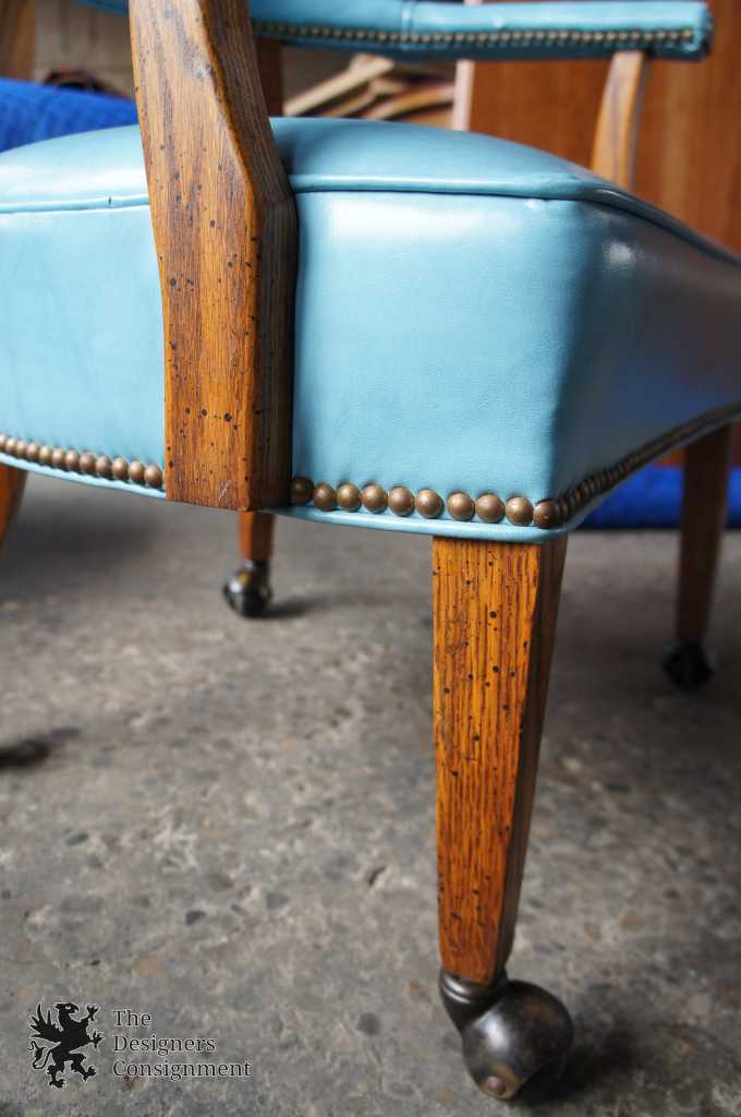 The perfect set for any breakfast nook or game setting. Made from Oak with Blue Leather upholstery and brass nail head trim. Each chair is on casters for ease of movement.
