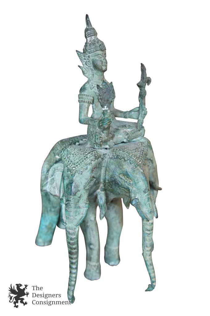 A beautifully designed cast bronze figure featuring a 3 headed elephant and Ganesha. In Thailand Elephants are the national symbol, and the 3 heads represent the qualities of strength, durability and longevity. The figure has a verdigris finish that makes it stand out in any setting.