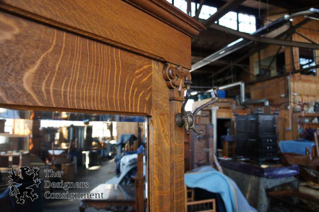 Exquisite turn of the century hall tree. Made from Quartersawn Oak. Features a beveled glass panel, ornate thick hanging cast iron hooks, umbrella holder, and carved trim. The bench seat lifts up for added storage. The perfect piece for any entryway. Seat Height - 18.5