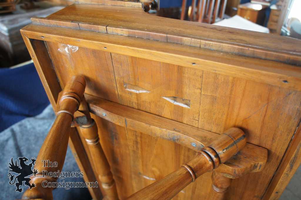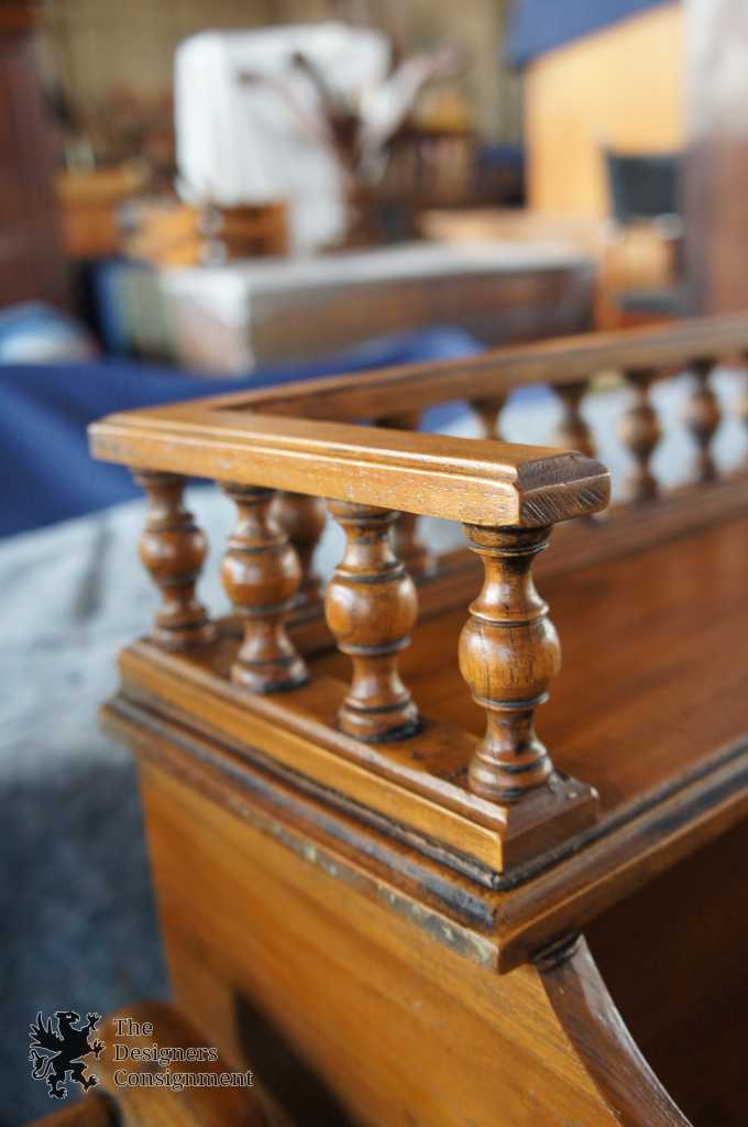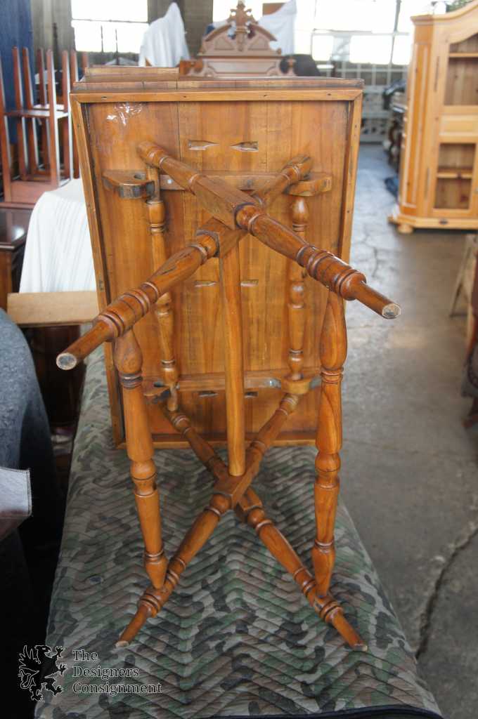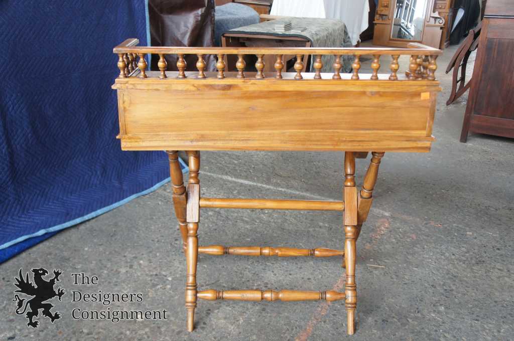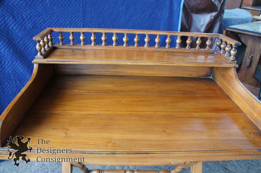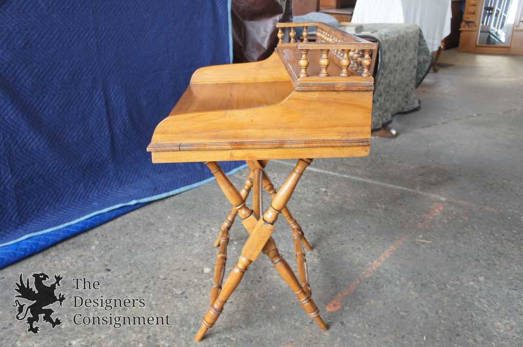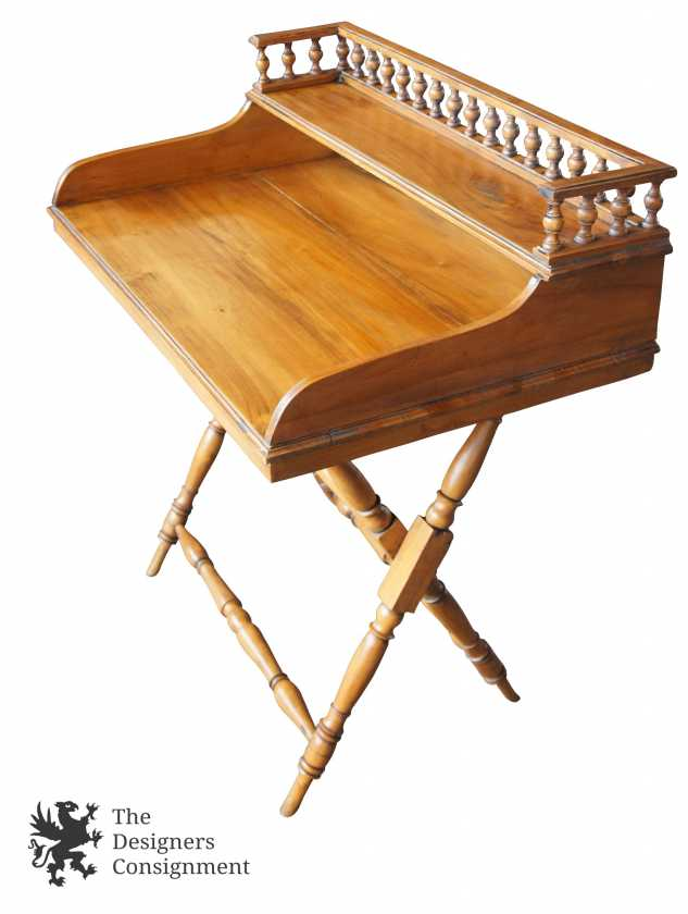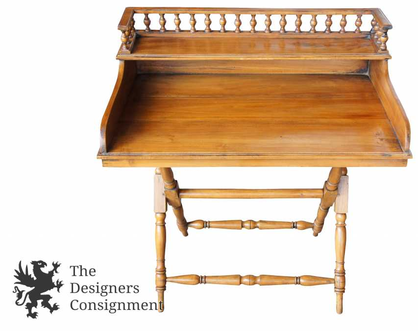Traditional mahogany campaign writing desk. 2 Tier with spindled back and a smooth upper rail. The desk can fold to be stowed away, or you can remove the base completely to save even more space. A neat addition to any setting.