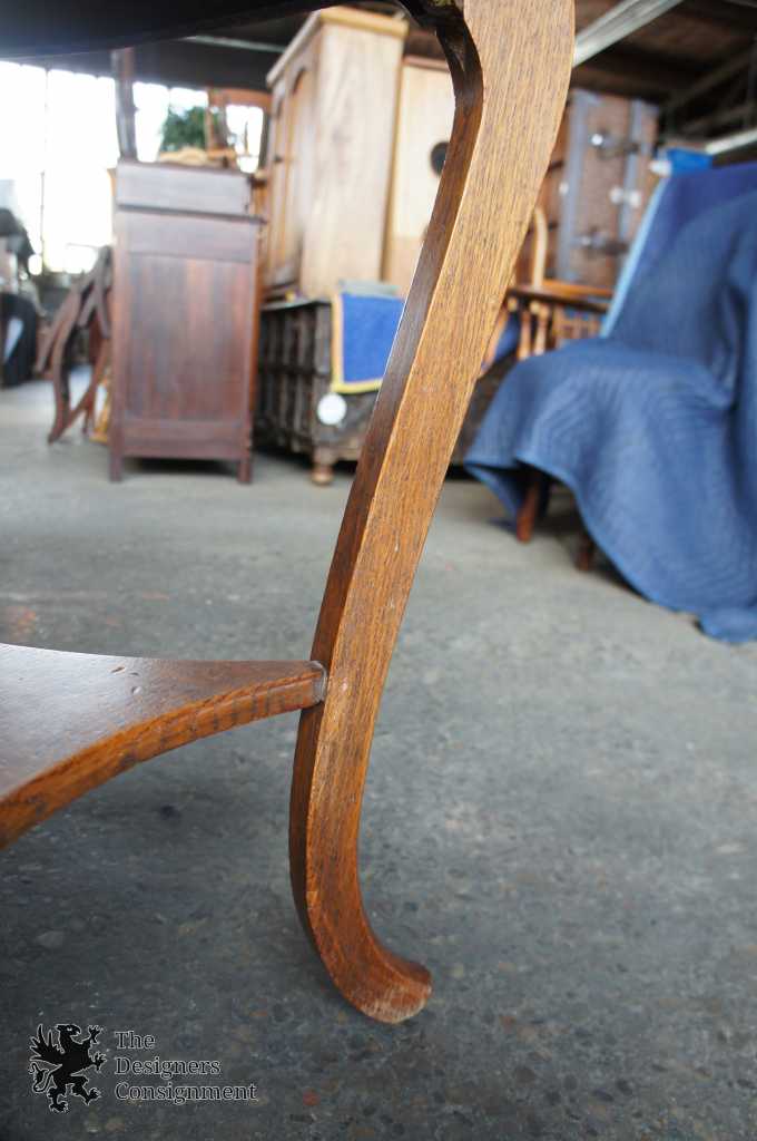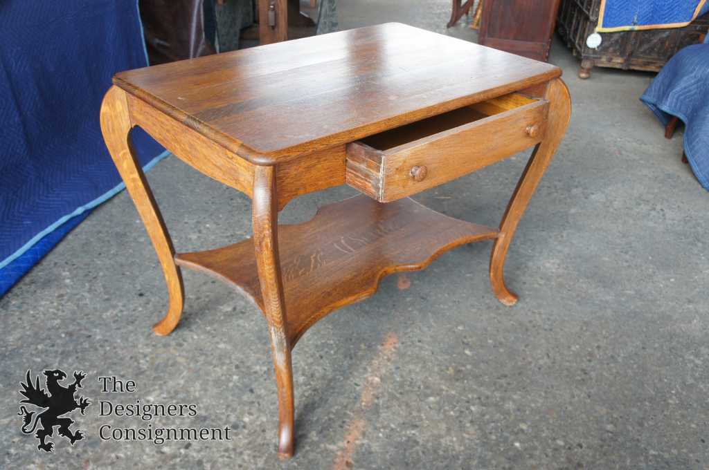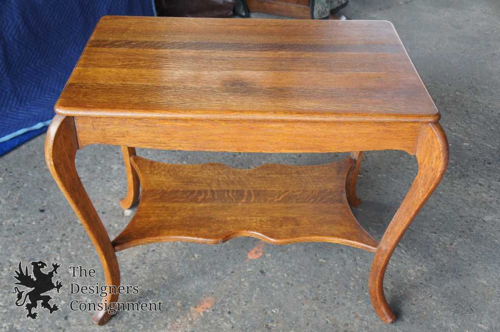 Early 20th century quartersawn oak library table with cabriole legs and lower shelf. The legs of this desk and lower shelf can be removed for ease of moving or storage.