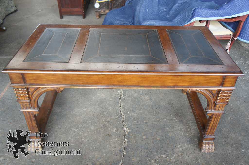 Exceptionally detailed antiqued reproduction office desk. Features a distressed mahogany finish with 3 panel tooled leather top. Each leg has a column like design with acanthus relief towards the top. Legs are connected by a stretcher from front to back and mounted over paw feet. A neat piece that will make a statement in any setting.