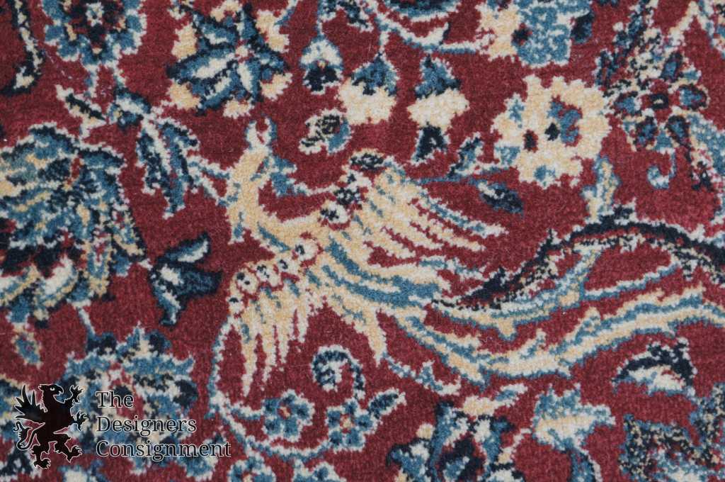 Traditional Persian/Oriental machine made area rug. Features a geometric design with animals (Phoenix, Birds, Deer). Predominantly reds and blues. In the picture there is a shadow that is appearing as a circle on the rug. This is not damage, just a reflection.