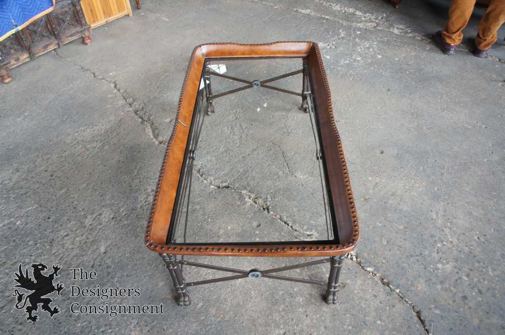 A beautiful coffee table by Lane Furniture. Features a raised leather trim with riveted accents. Base is iron in an x pattern with round medallions and claw feet.