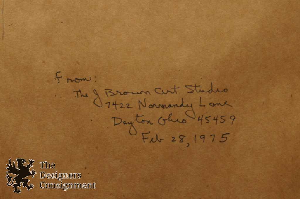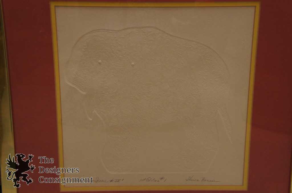 An original embossed etching titled a unknown, but most likely some type of Elephant. This comes from Vanishing Species IV, by Ohio artist Sheila Bonser. This four panel reverse relief etching, goes from Red to Orange to Pink with only the embossed outline present in the lowest section. Each picture is outlined in a yellow border and set in a red mat. The piece is protected by glass and a brass gold toned frame.