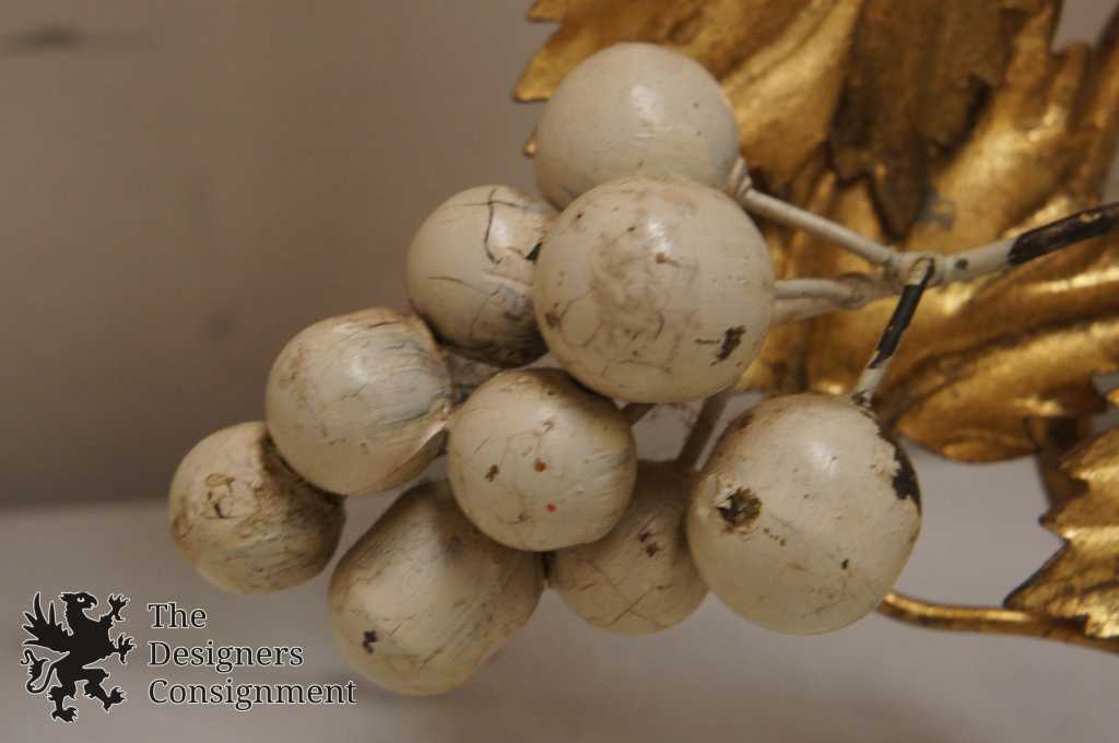 A beautiful Italian Florentine metal/tole wall sconce. Designed in a grape vine pattern with branches of gold leaves and white grapes. Features space for 2 candles. A great addition to any setting.