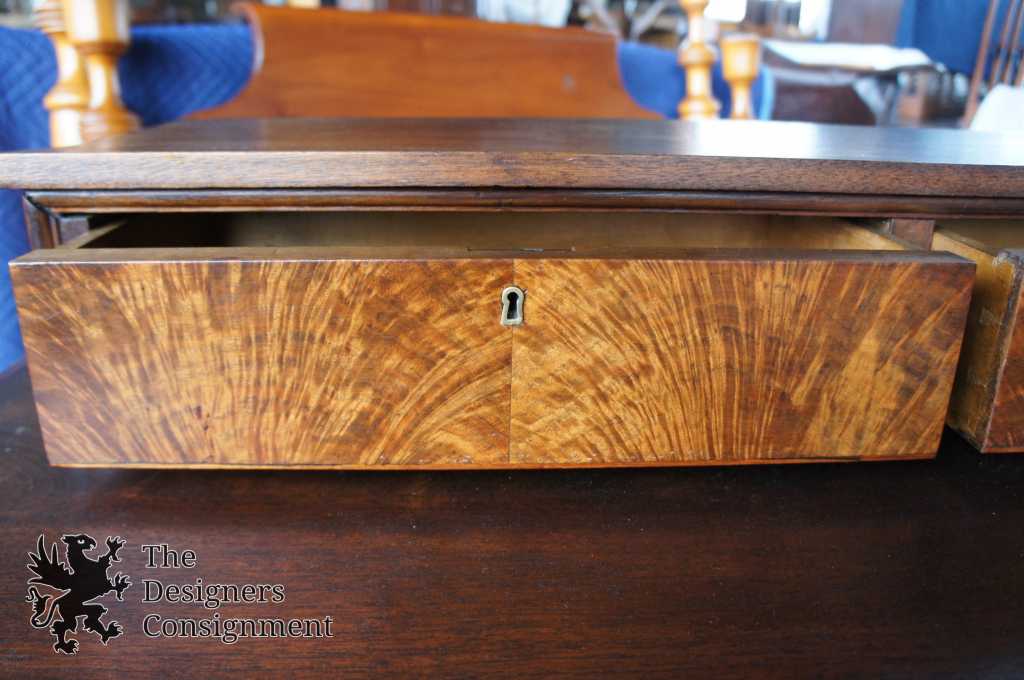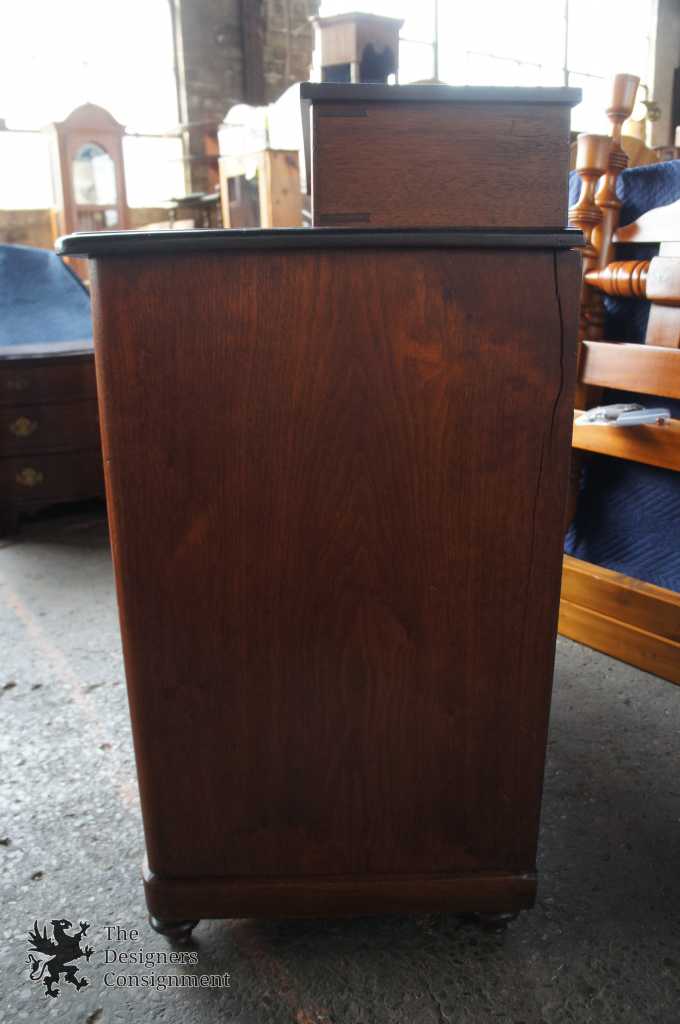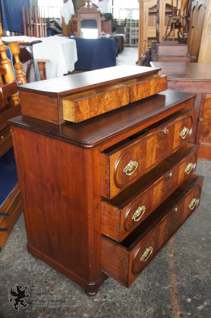 Up for consideration is a gorgeous 19th century 3 drawer dresser with upper step-back featuring 2 additional drawers. Made from Walnut with flamed drawer fronts and classic Victorian brass hardware. Drawers are hand dove-tailed. The perfect addition to any setting.