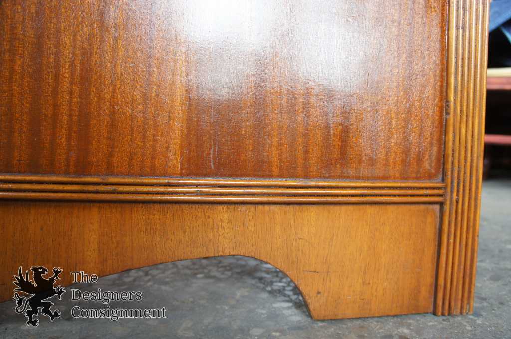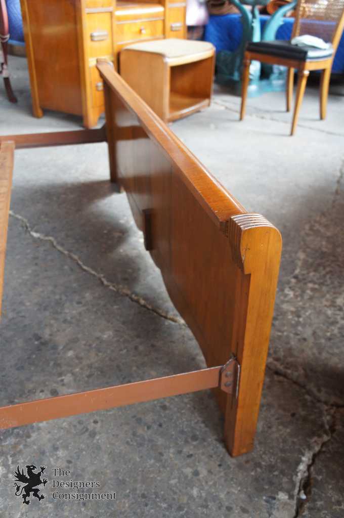 A beautiful Art Deco Era Full Size Bed. Made from walnut with a waterfall footboard. Headboard features a flamed walnut with a unique inlaid horizontal band going across the middle. A neat addition to any setting.