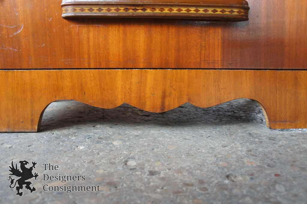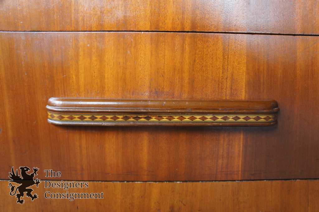 A gorgeous waterfall dresser made from walnut. Features a unique horizontal inlay along the top of the chest and drawer pulls. Upper drawer has Bakelite handles. Lower apron has a neat curly bracket shape. A great addition to any setting.