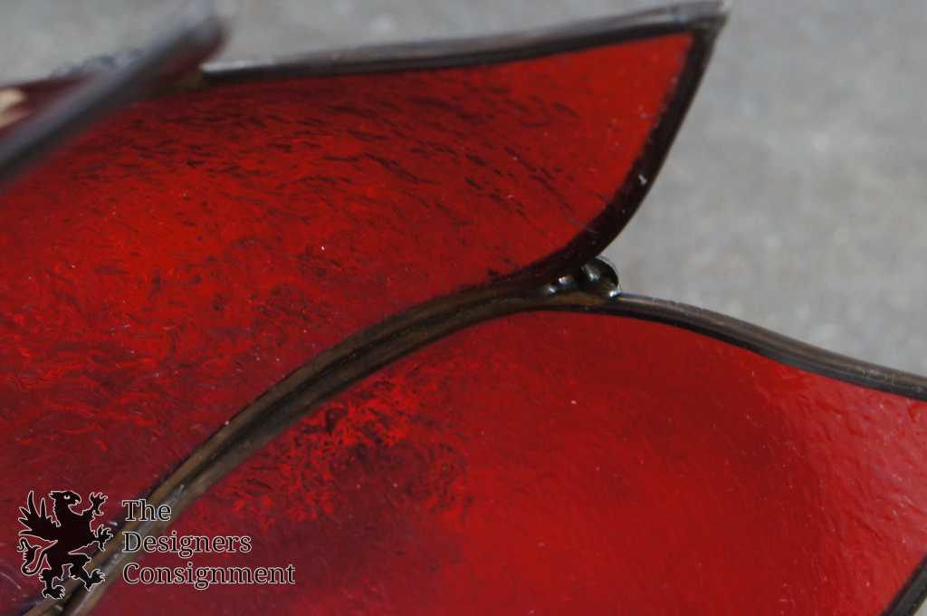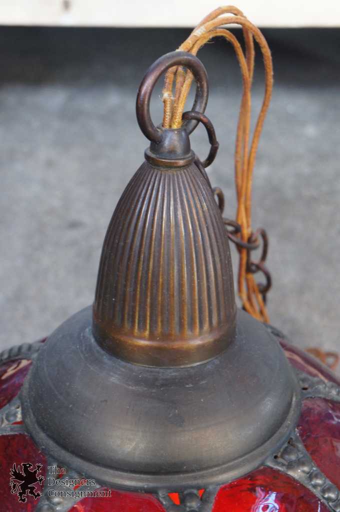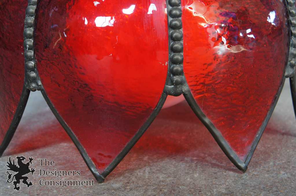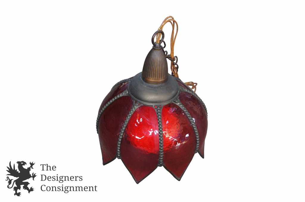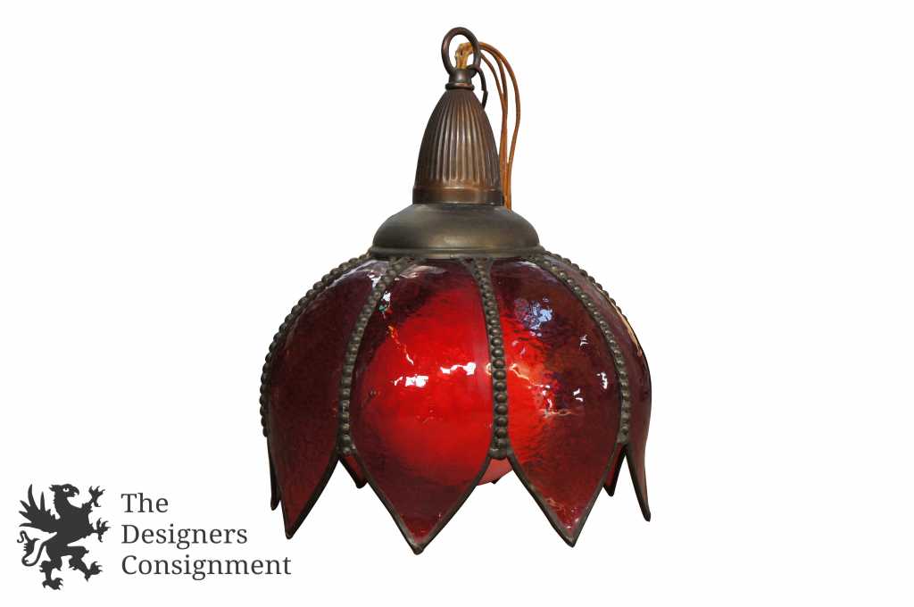 Mid Century Tulip Pedant light. Red slag glass with beaded brass design.