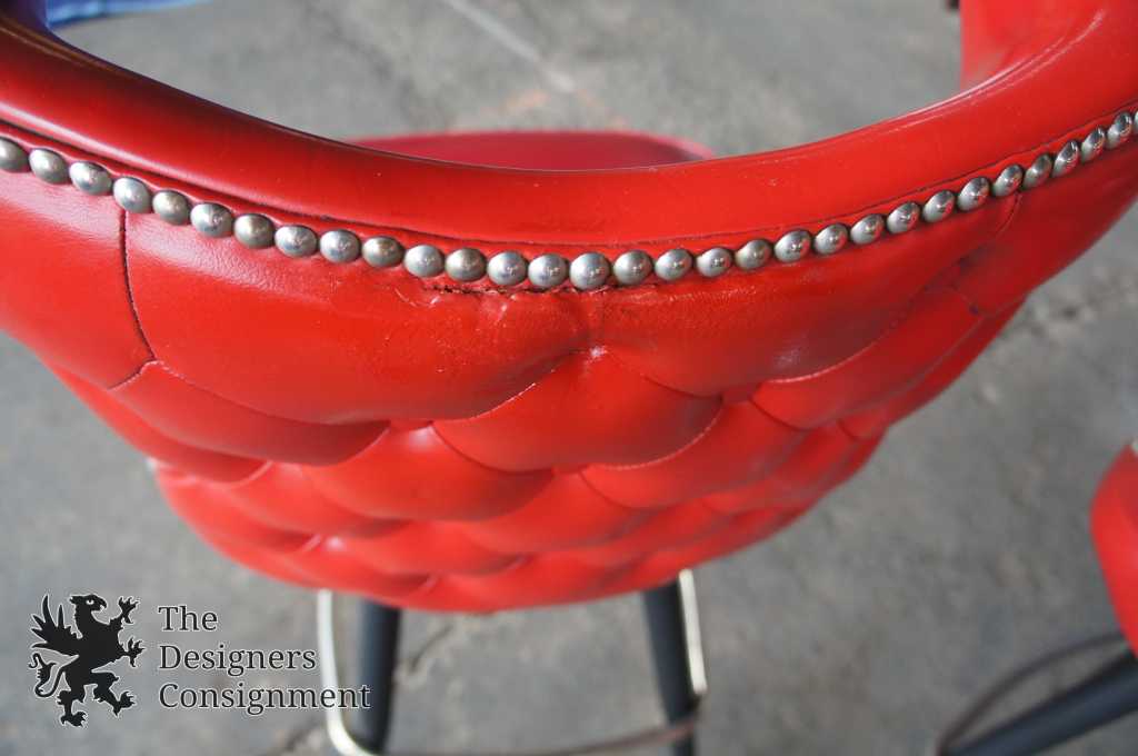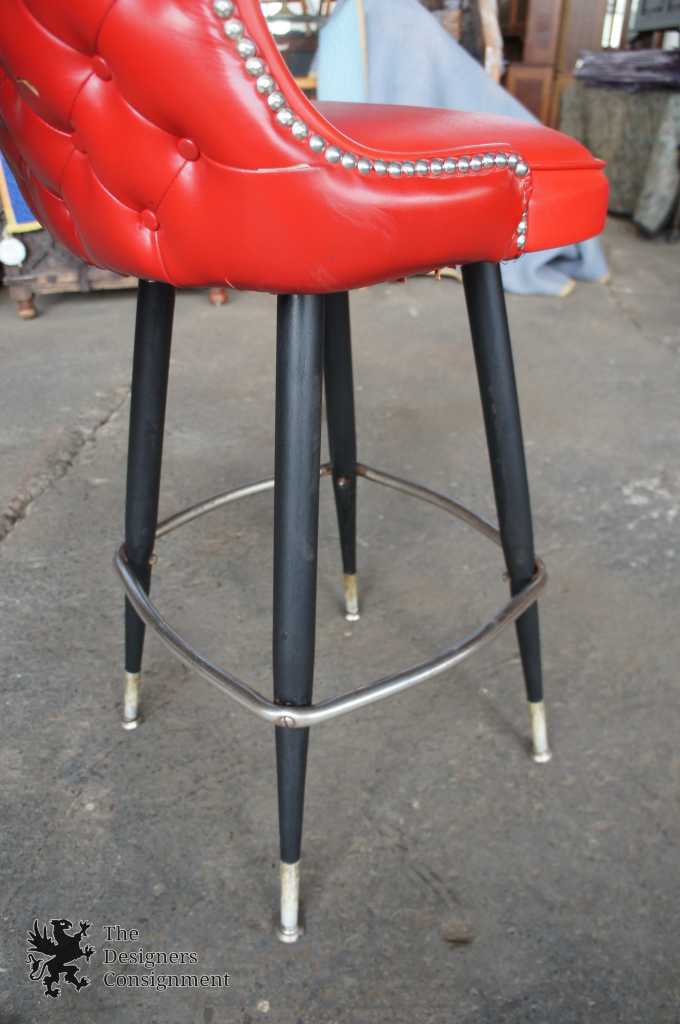 A beautiful pair of bar stools from the Oakwood Club in Dayton, Ohio. These were some of the first stools that sat around the bar when they opened in 1962. Features a wing-back design with tufting. Upholstered in a red leather with nail head trim, aluminum cast legs and a chrome foot rest. The chairs swivel. A neat addition to any collection