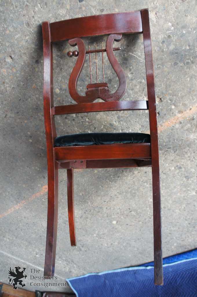 Antique mahogany harp back dining chair. Features velvet seat and saber legs.