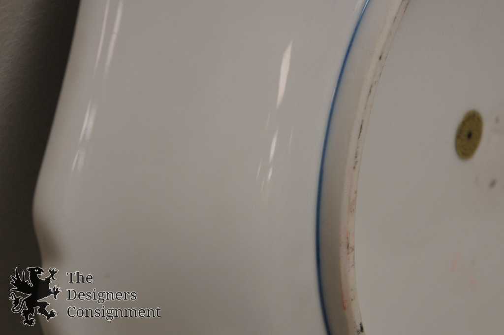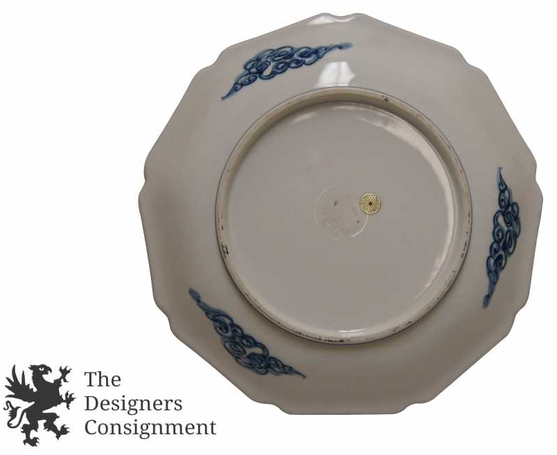 Takahashi transferware plate. Blue and white with gold trim. The plate has a lattice work design around the border and a floral lion theme at the center. A neat display piece for any setting.