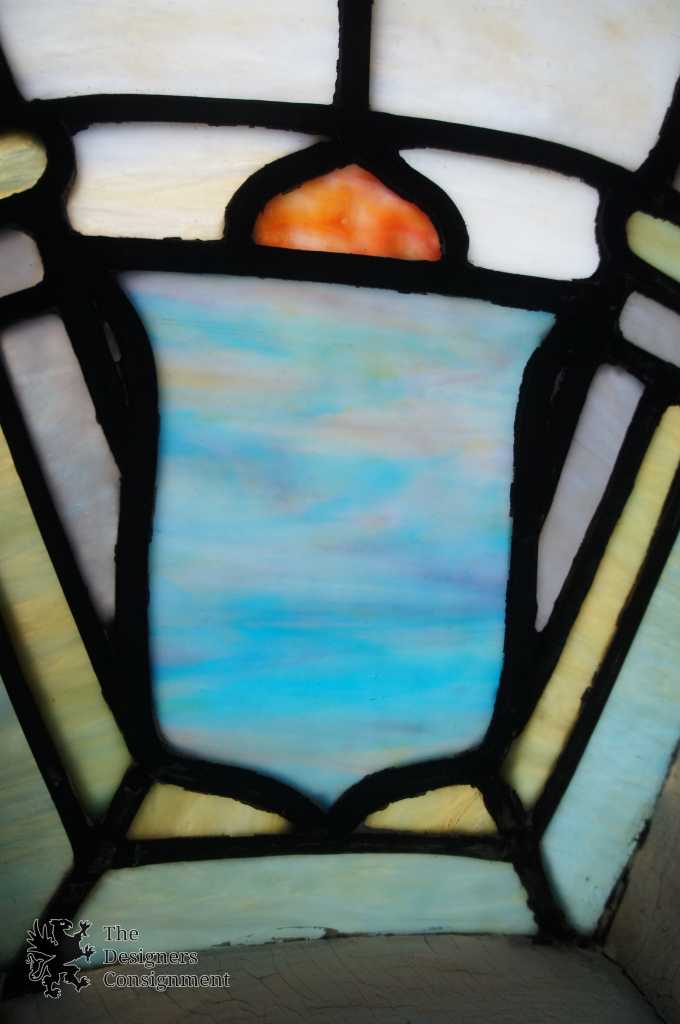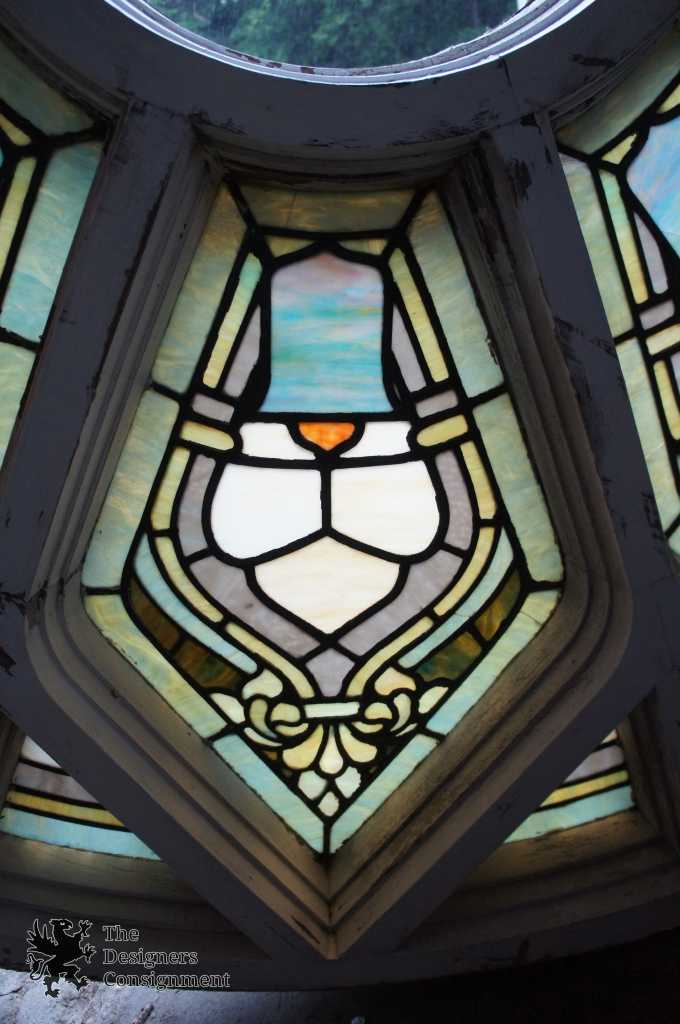 The window is in very good shape for its age. The central panel which once sat in the middle is no longer with it. There are some small hairlines in the slag glass. I was only able to find one tiny chip where the light is let through. This can be seen in the last photo. There is some paint loss on the white side from over a centuries use and some molding missing.