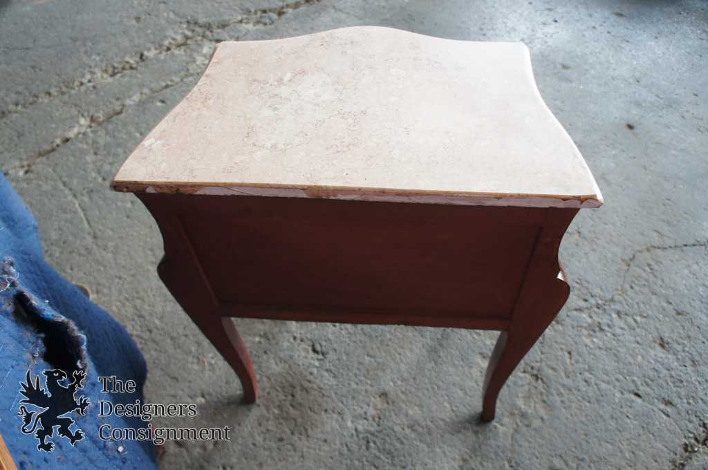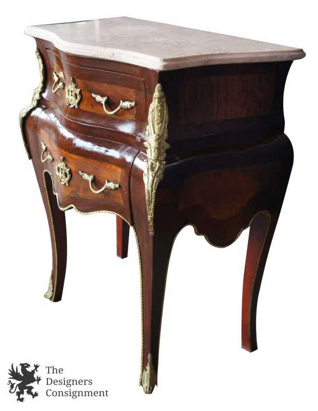 C. 1960s Louis XV style Bombe chest. Mounted with gilt hardware and light pink marble top. Made from Mahogany with an exotic burl inlay. A neat addition to any setting.
