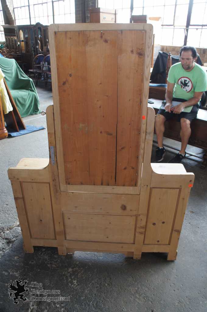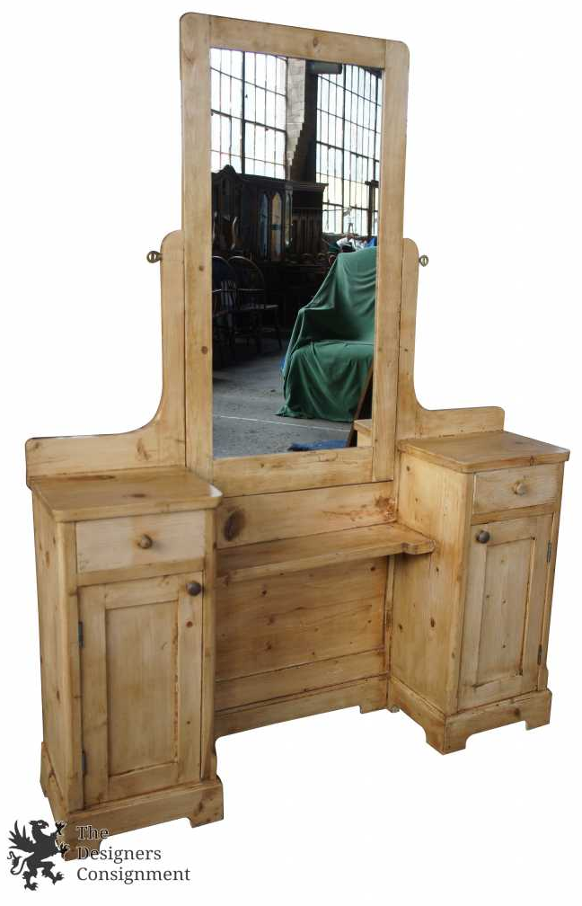 Up for consideration is a beautiful slimline primitive that could be used in an entryway, or as a dressing table. A handmade early 20th century danish vanity that was imported from England. The buyer was originally informed mid to late 1800s, but we have this piece pinned to the earlier part of the 20th century. Made from an unfinished pine giving rustic character. At the center is an adjustable mirror and table surface that is flanked by a drawer and lower cabinet along each side. Upon opening each interior cabinet has one fixed shelf. Drawers are dovetailed, and pulls are hand turned. A neat piece that will make for great conversation and use in any setting.