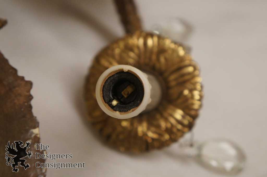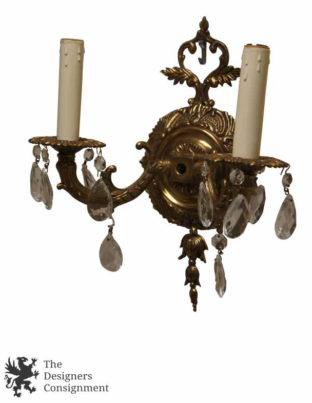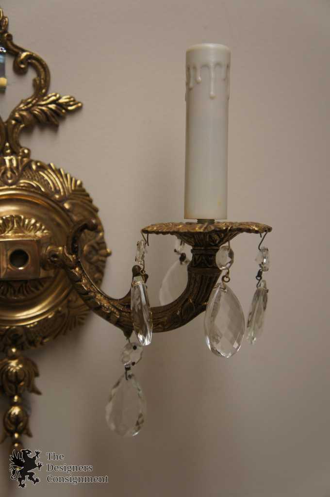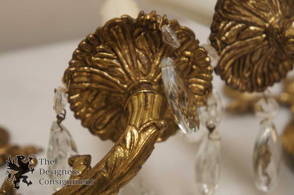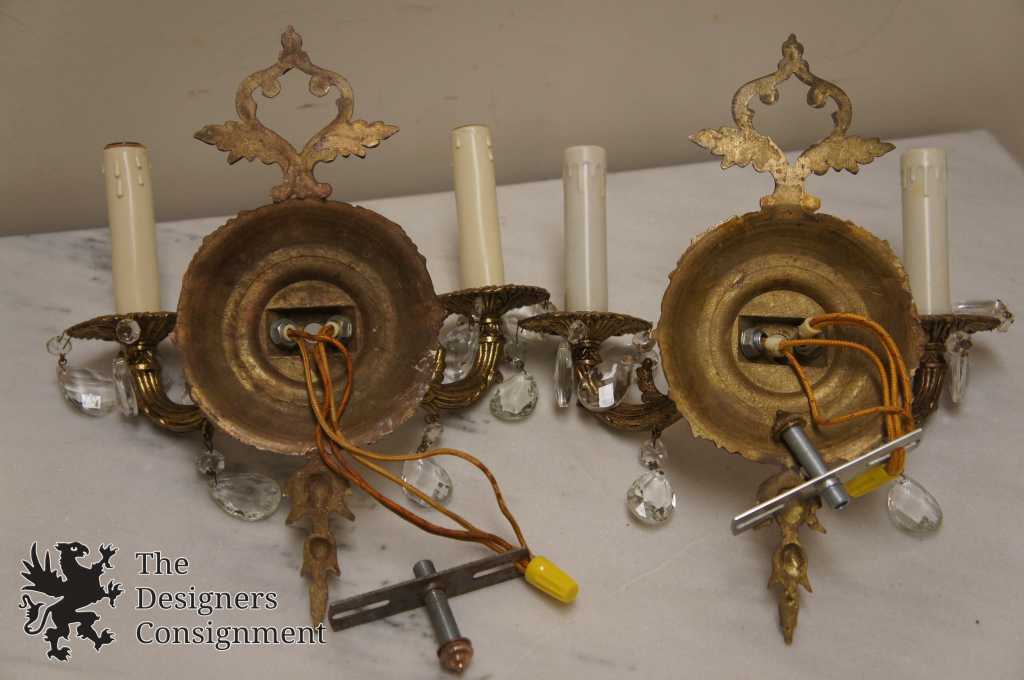Lovely pair of Hollywood Regency style wall sconces. French inspired with flourishes and drop crystals. A nice addition to any setting.