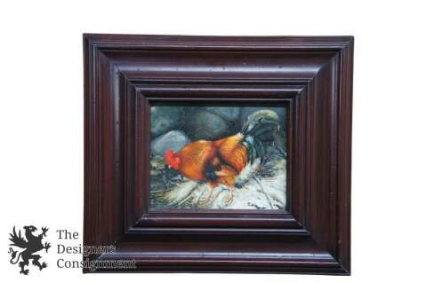 Standing rooster painted on canvas in mahogany finished frame with distressed accents. Unsigned, 20th century