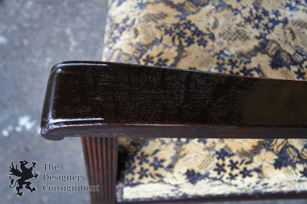 Up for consideration is an exquisite antique throne chair. Made from solid quartersawn (tiger) oak with a nice dark stain. Features a Gothic style with a pierced cathedral back. The three pierced panels show a clover design. The chair is topped with 3 finials in a fleur de lis fashion. Fabric is a goldish color with black accents in a brocade pattern. Upholstery shows riveted nail head trim. A very solid piece that will make a great addition to any setting.