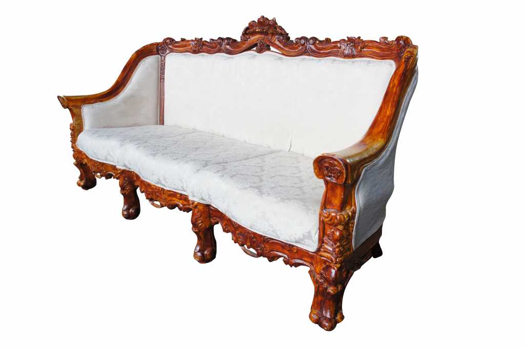 Light use related wear. The pillows are not professionally upholstered and have loose seems and gaps. Sofa has a mahogany tone finish that is lighter on the back side around the edges.