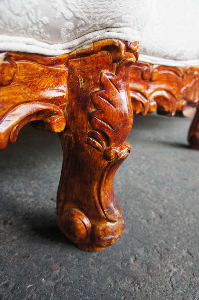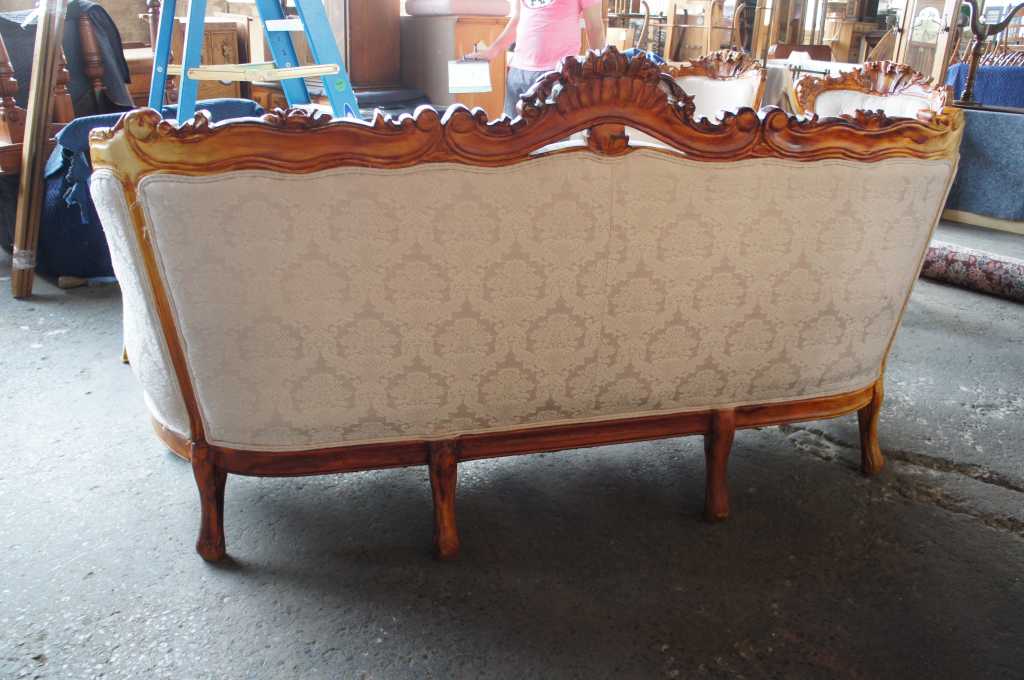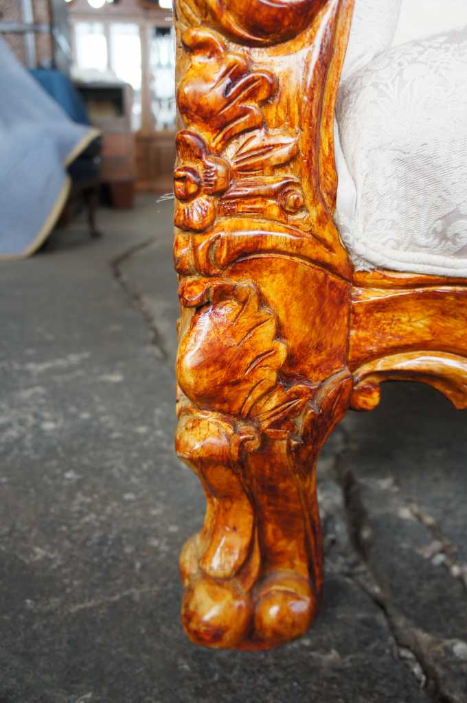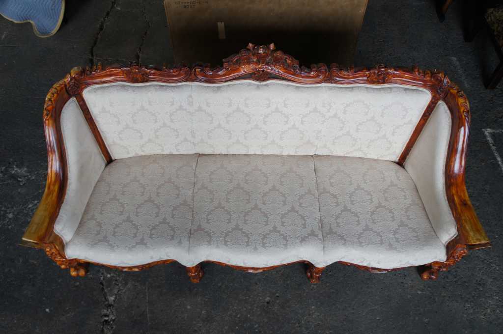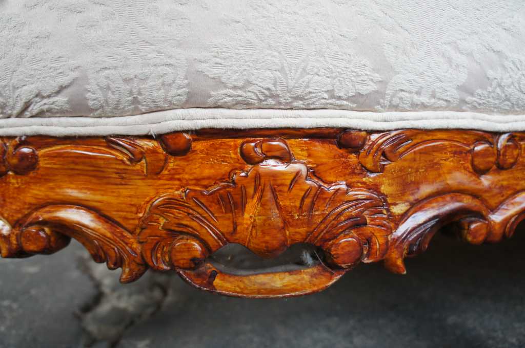 Exceptional Baroque Rococo designed sofa. Features high relief scalloped floral carvings. Upholstered in a brocade fabric. The perfect statement for any setting. Matching Chairs Available.