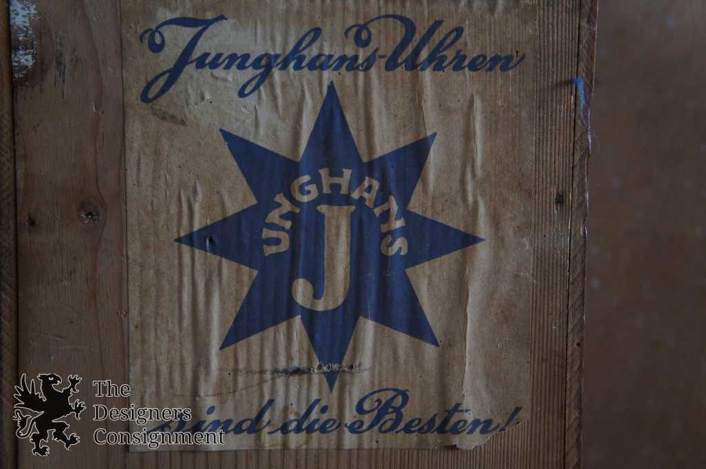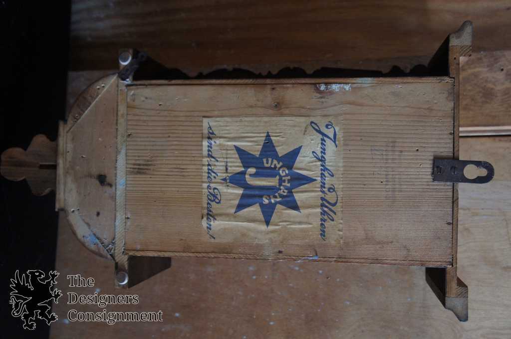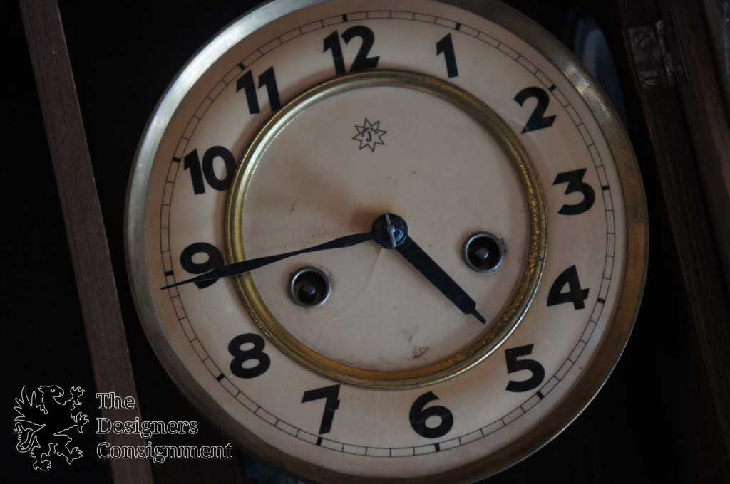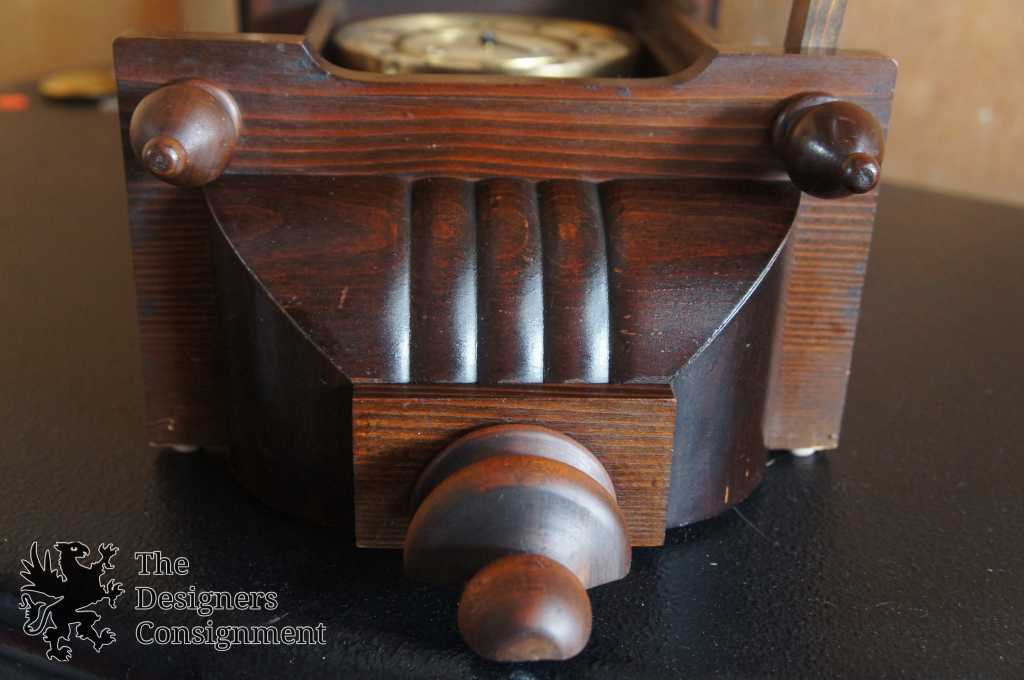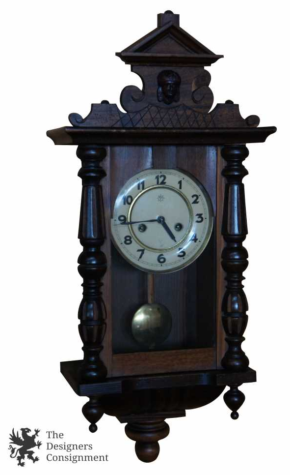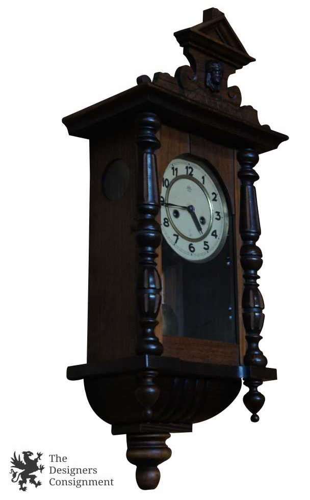 Early 20th century Junghans wall clock. Made from Nutwood with beautifully turned accents and carved detail. Empire style.