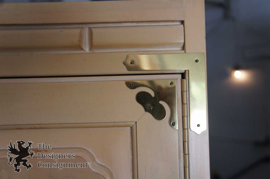 A gorgeous pair of Asian inspired campaign cabinets with drop down secretary surface. Circa 1989. Light wood tone with burled panels. Features 3 upper drawers for storage, a drop front cabinet and 2 drawers. These were originally made to be paired next to a bed, which is why the table surface is nightstand height. However, these can be used in any setting. Model #049-146.
