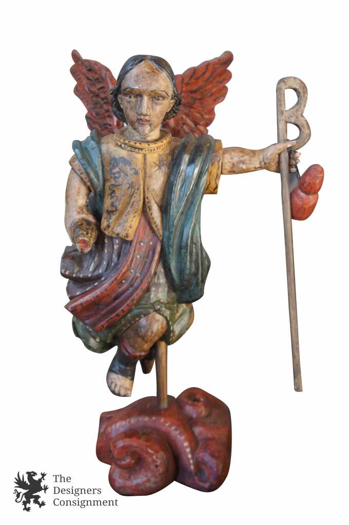 Meticulously detailed carving of the archangel Raphael. He is set on an elevated stand with his legs off the ground. There is a staff with gourd in his left hand, and fish in the other. Hand painted with colorful detail. The piece breaks down for ease of movement and display.