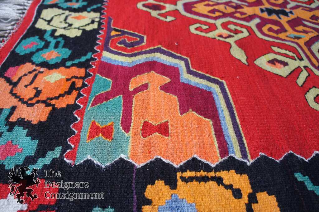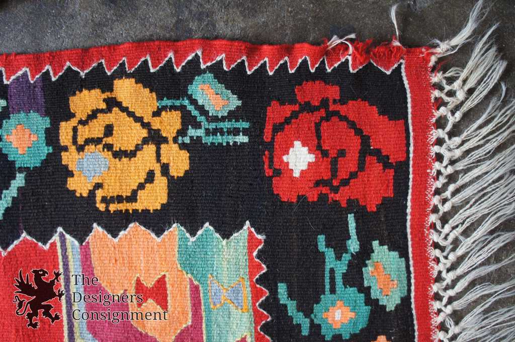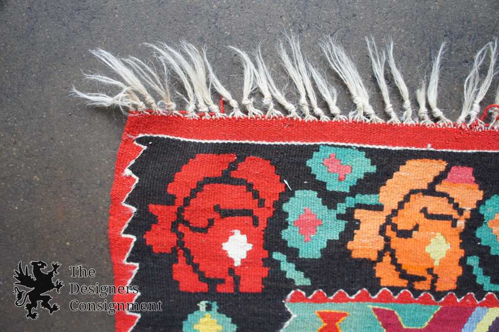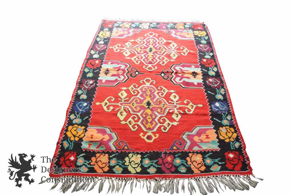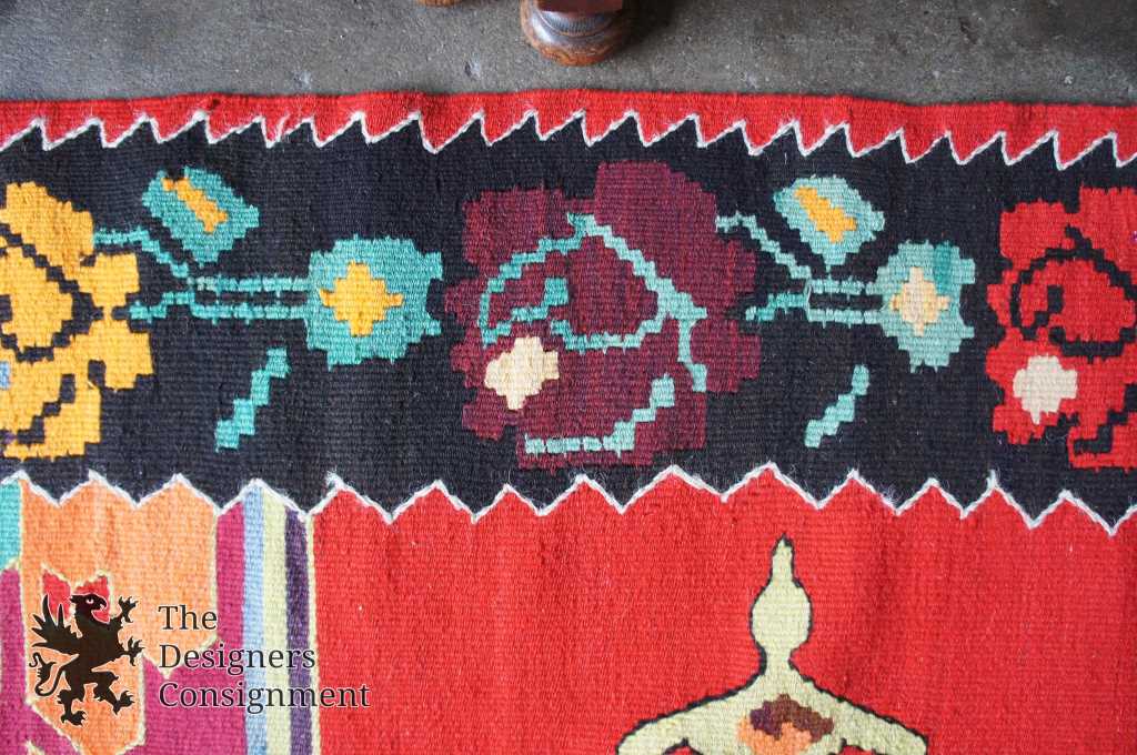 A gorgeous Turkish kilim rug. Red with black boarder and colorful rose design. The perfect compliment in any setting.