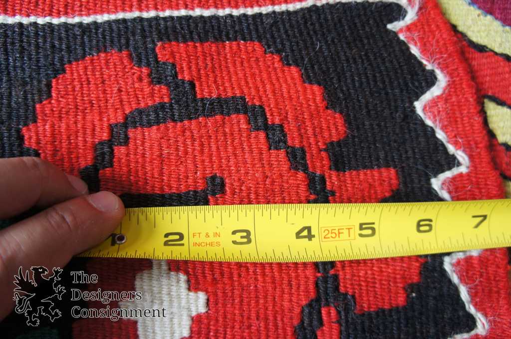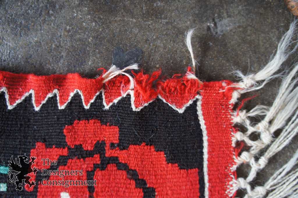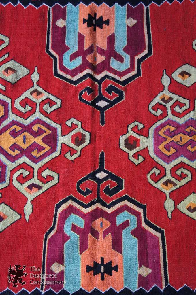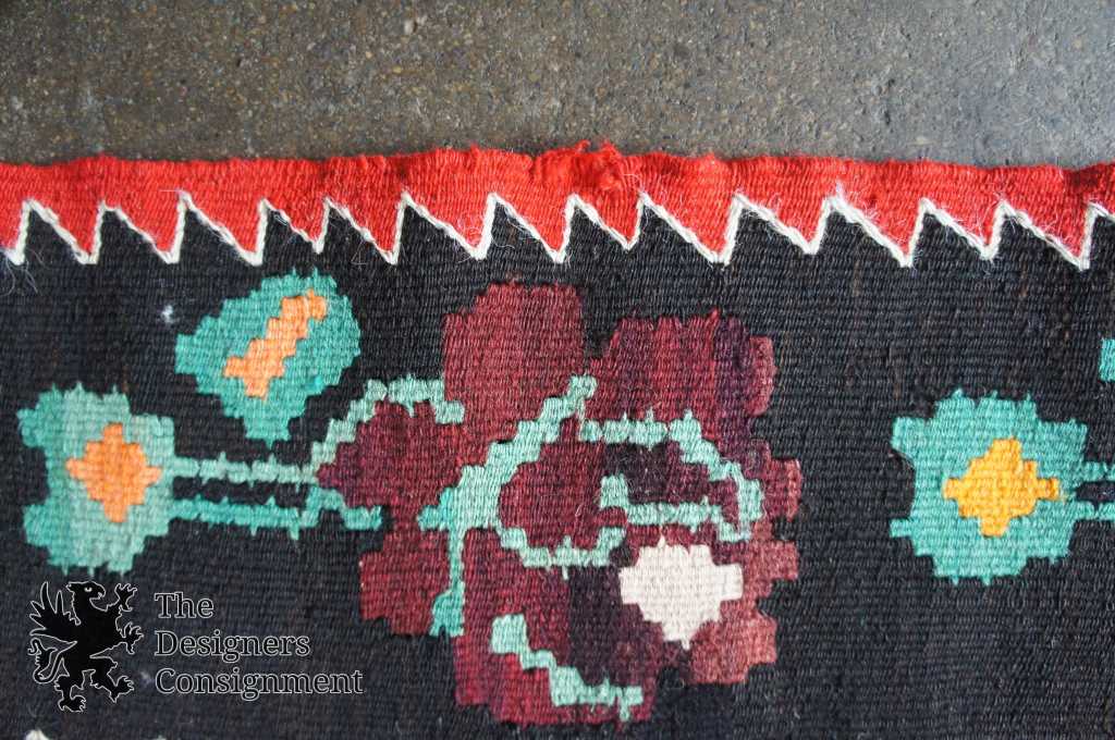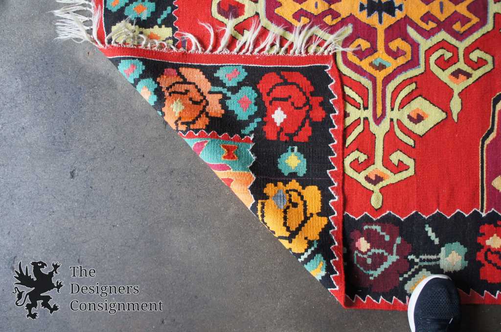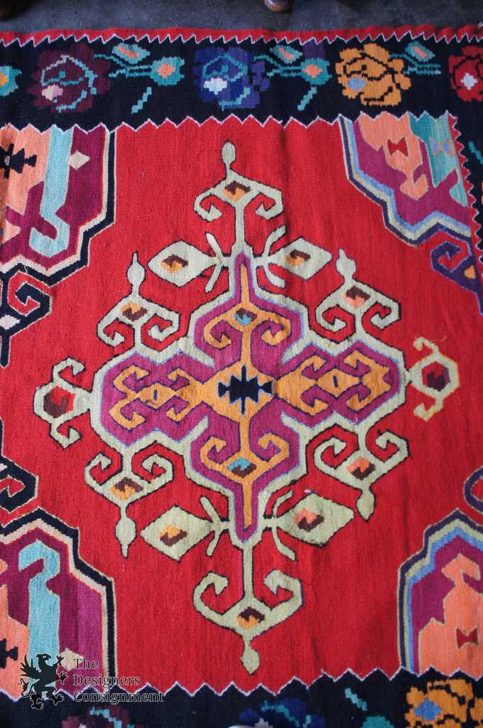 A gorgeous Turkish kilim rug. Red with black boarder and colorful rose design. The perfect compliment in any setting.