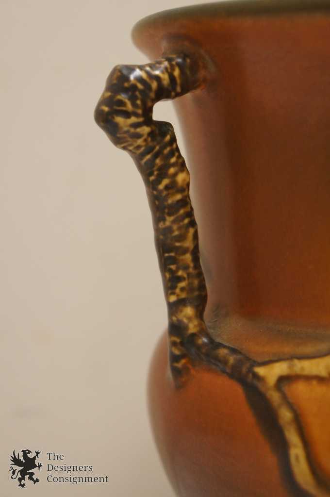 Roseville Pottery handled pine cone vase. Finished in brown with an elegant design. The perfect display piece for any home.