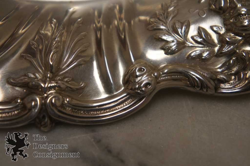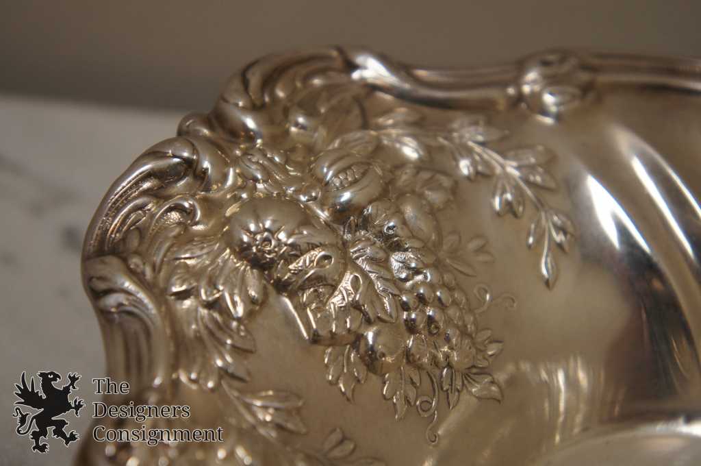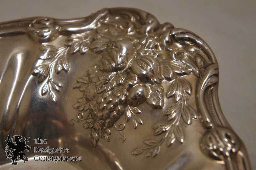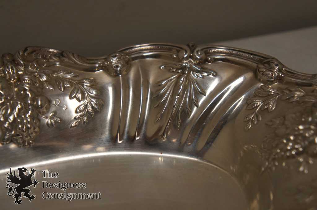 Here we have a sparkling .925 sterling silver Reed & Barton bread tray. The popular Francis I pattern was originally designed by Ernest Meyer for Reed & Barton in 1906. Featuring exquisitely rendered flora themes throughout including various flowering plants, and edible fruits such as grapes and pomegranites framed in leafy 'olive crown' arrays, and intertwined with a sensous scalloped rim with 'scroll' details. Marked Reed & Barton Sterling, X568 Francis I