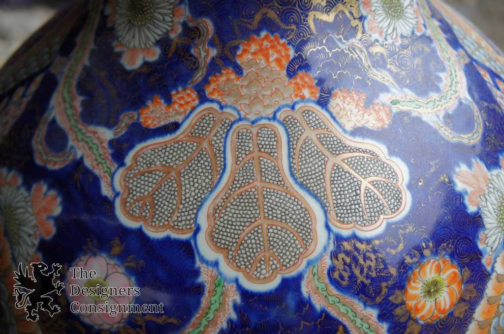 Exquisite antique Famille Rose blue floor vase. Meticulously detailed in red, blues, oranges, green and gold. Each side shows 2 elaborate phoenix's gazing into each others eyes. Mouth of the vase shows an elaborate floral motif. A gorgeous overall piece that will make a statement in any setting.