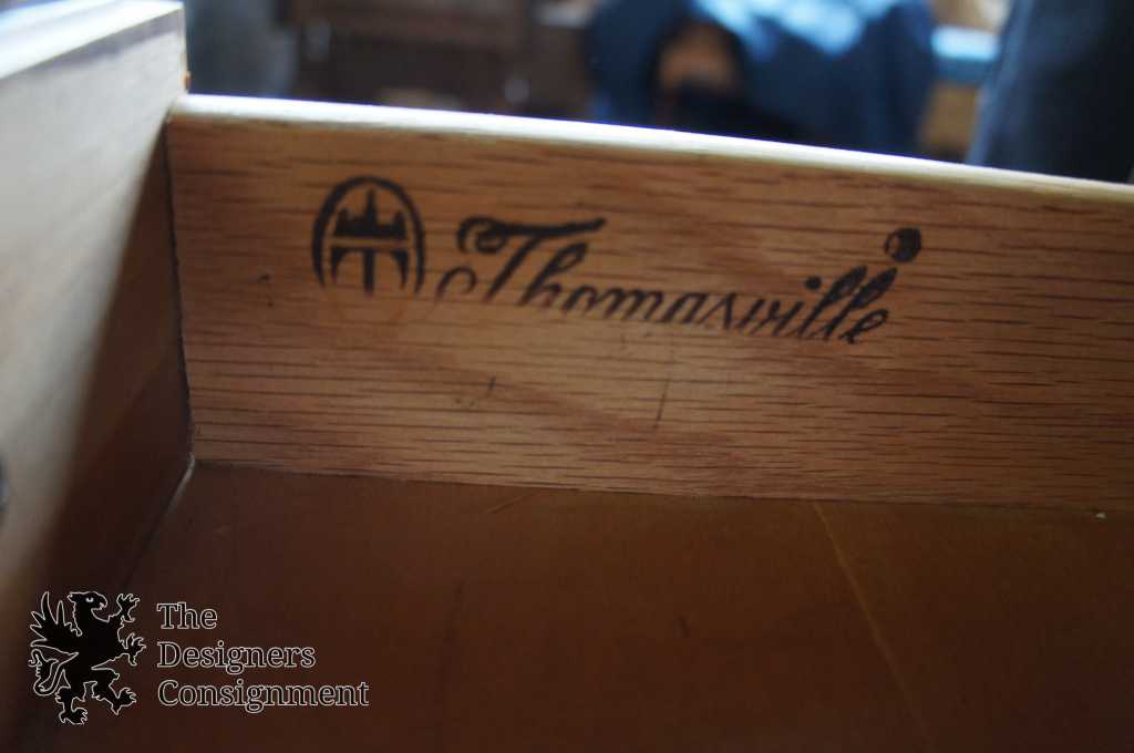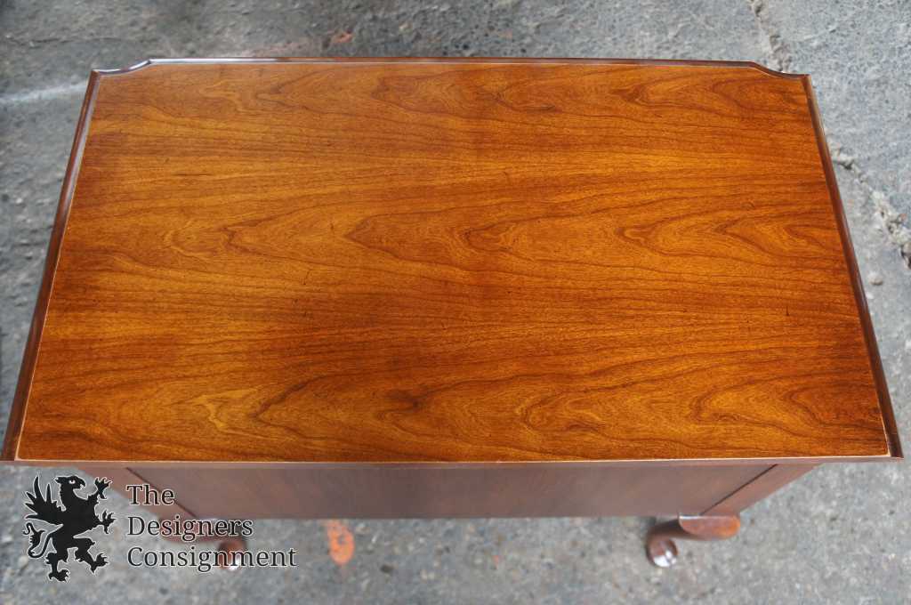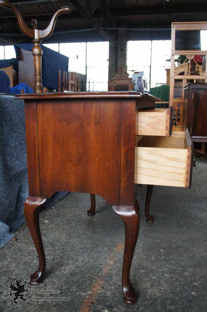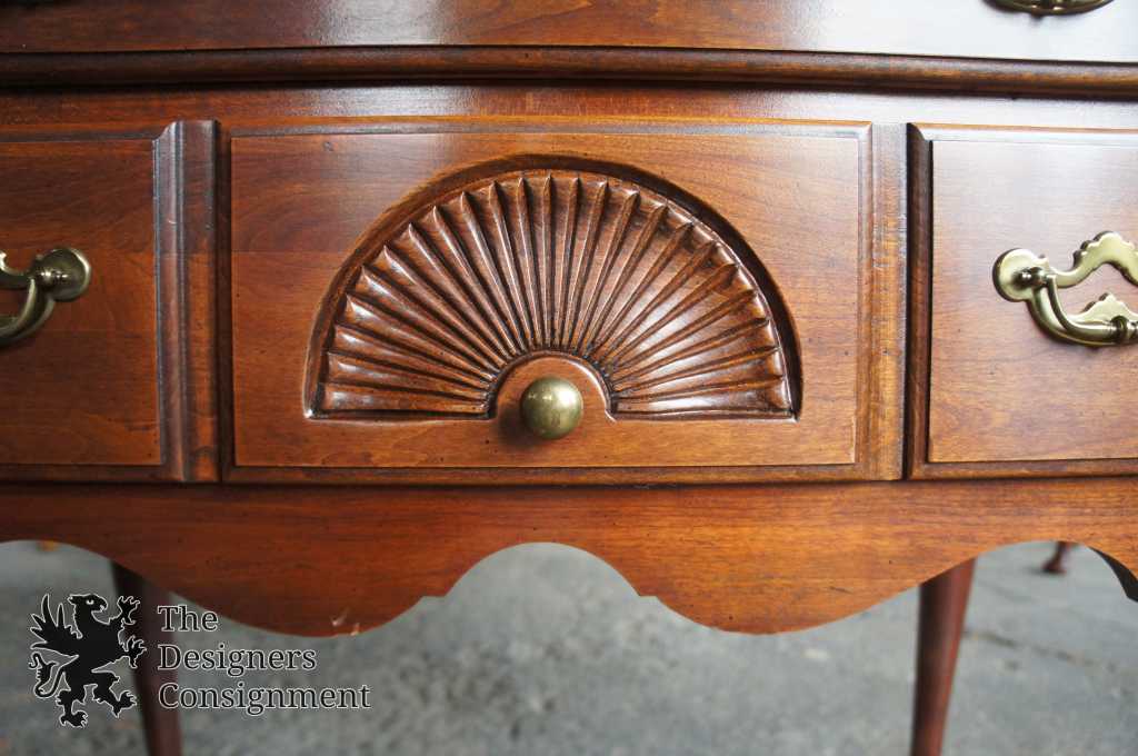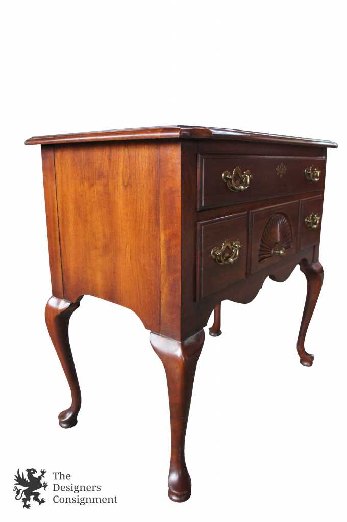 A gorgeous Thomasville Queen Anne style low boy. Made from cherry wood with elegant detail. 2 dovetailed drawers over cabriole legs leading to pad feet. Drawers are accented with brass hardware and a scalloped design at the center. Originally purchased 25 years ago at the Furniture Patch Inc in North Carolina. You will be the second owner of this piece.