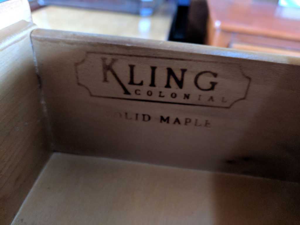 Kling Furniture company was created in 1911 by John Alexander Kling a Swedish immigrant. The company was stated in New York State, where it later became one of the largest volume producers of fine furniture in the US. Up for consideration is a beautiful colonial highboy dresser. Made from solid maple with carved accents and Chippendale hardware. All drawers feature dovetailing and glide smoothly. Kling Colonial was made between 1962-1990.