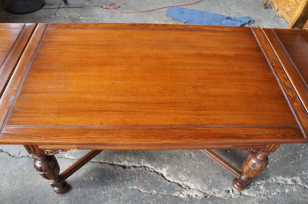 An Impressive Elizabethan style Oak Draw-Leaf table. Features a thick plank top with pull-out leaves on each end, Bulbous carved legs and bun feet connected by stretchers. Includes free delivery via White Glove Service