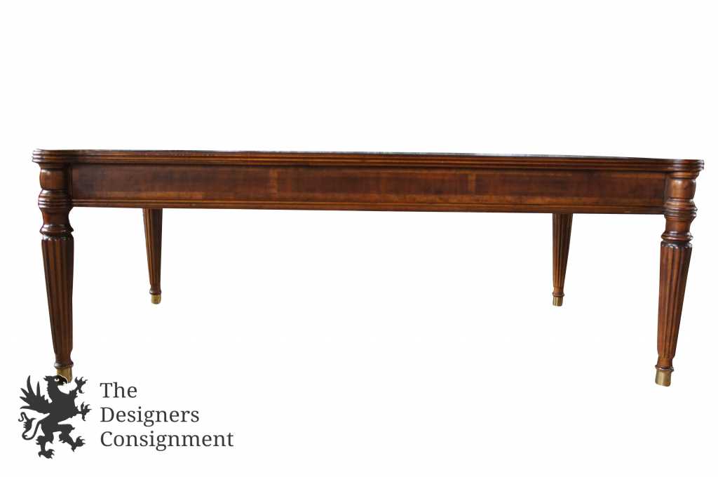 A beautiful Henredon turtle top coffee table. Made from Mahogany with a flamed top. Traditional styling with tapered and fluted legs leading to brass capped feet. A gorgeous piece for any setting. Matching side tables available separately.