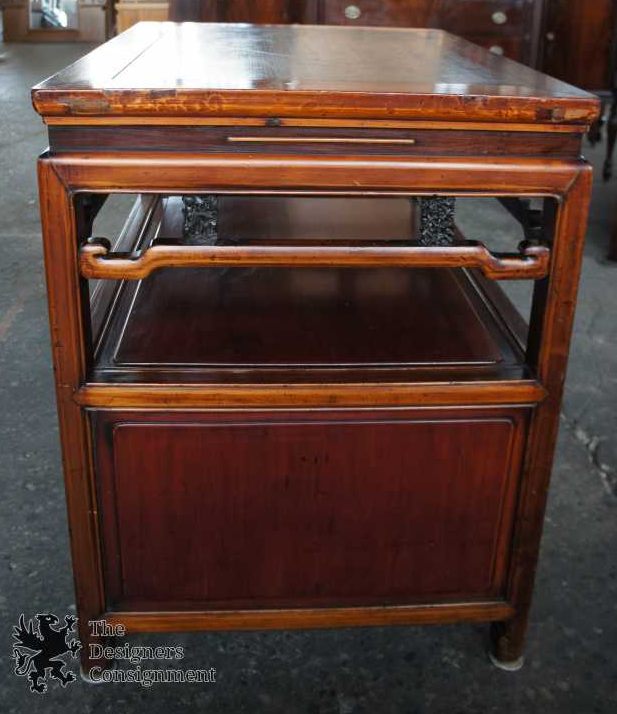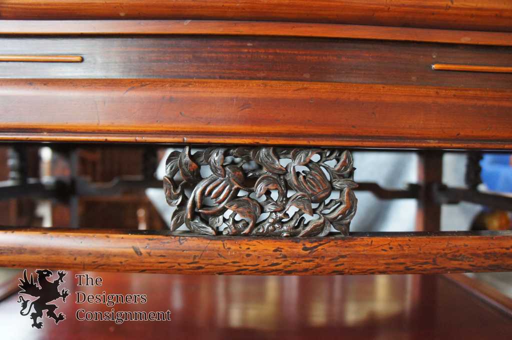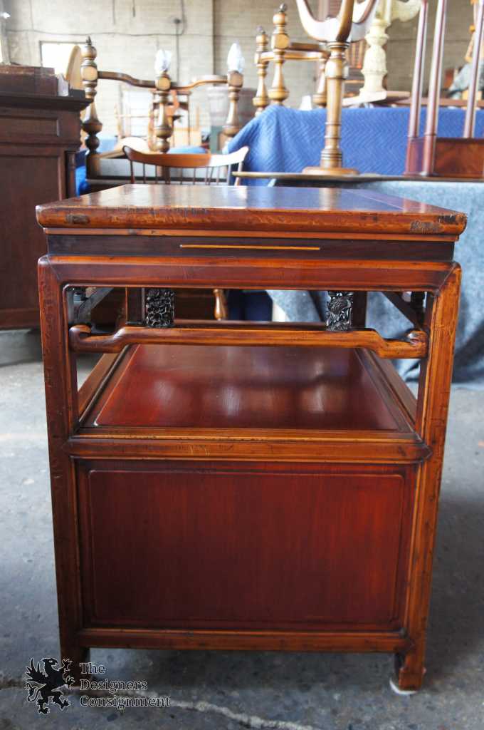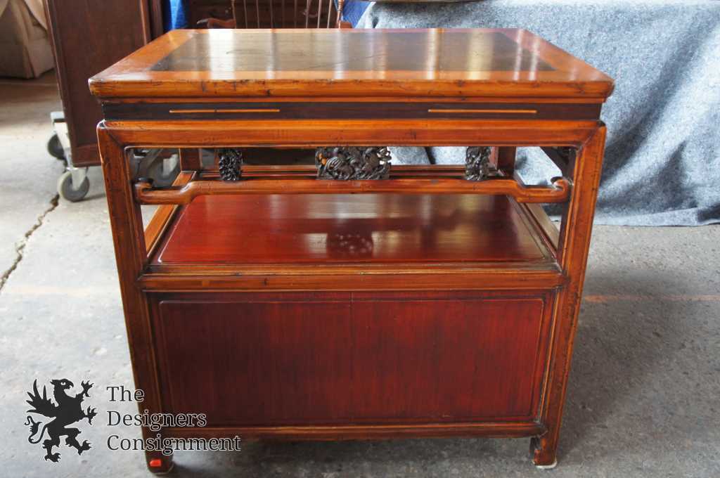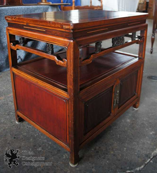 Stunning 19th century rosewood 2 door cabinet. Ming style with 2 tone designed finish. Features a floral carved apron, brass embossed hardware and mortise and tenon joints. The doors along the bottom are removable allowing for an open or closed design. A great accent piece for any setting.
