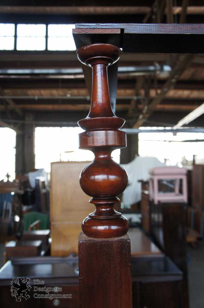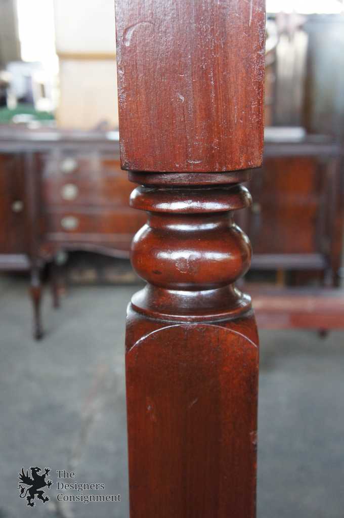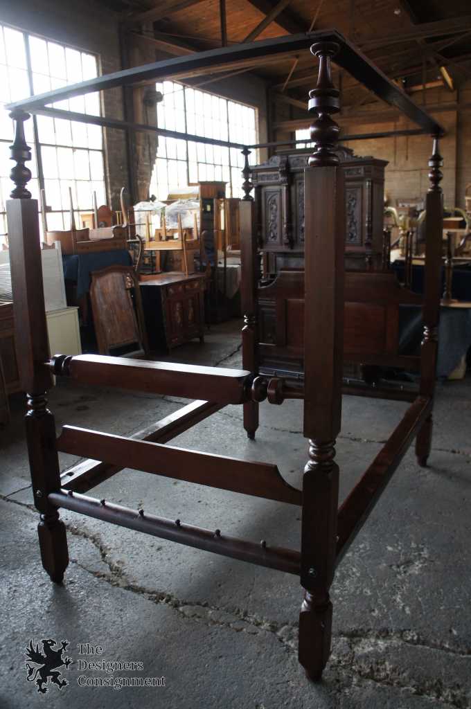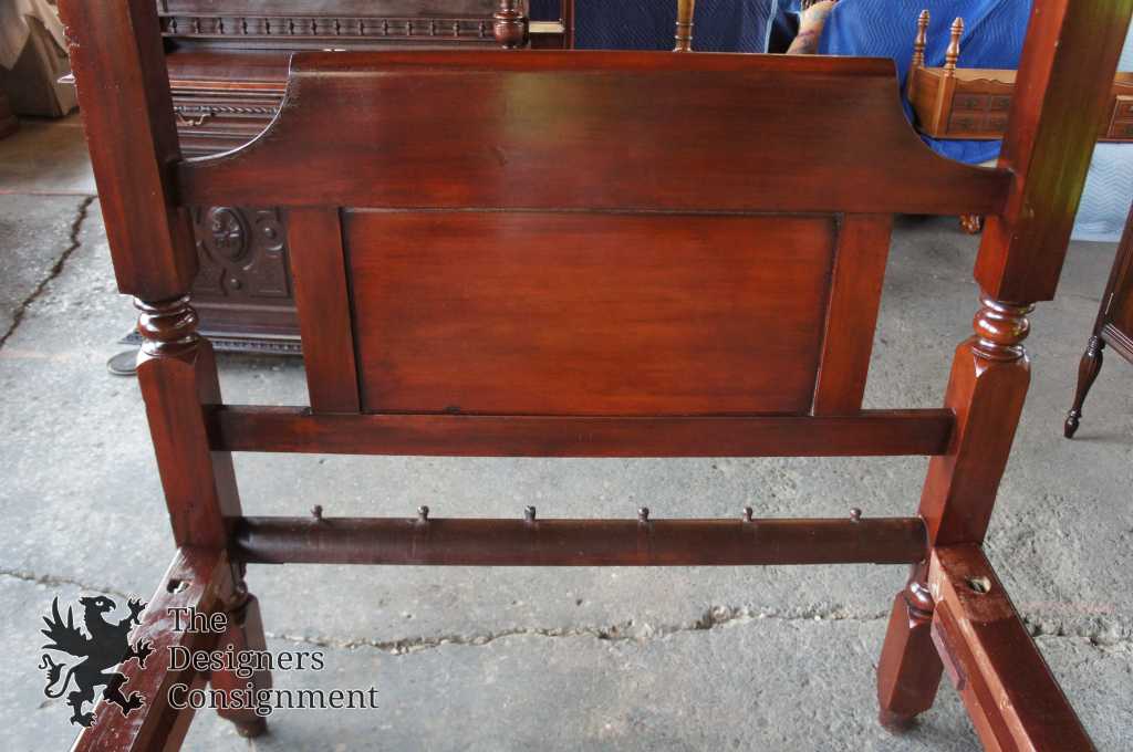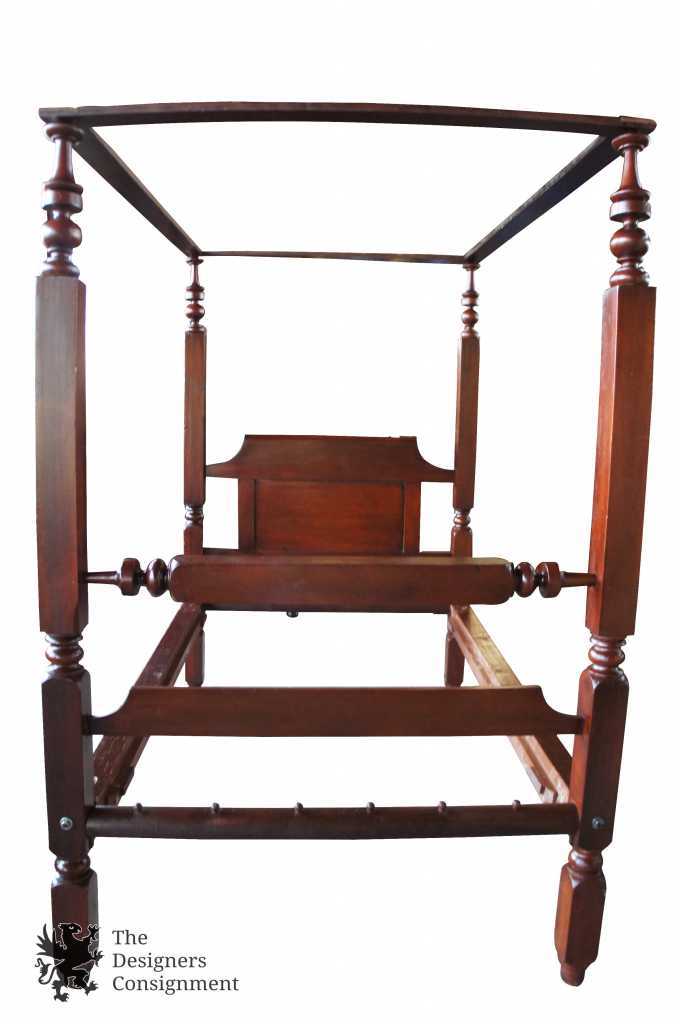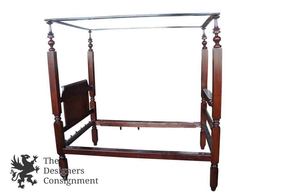 Beautiful 19th century colonial farmhouse bed. Made from walnut with thick posts featuring turned accents, finials and canopy. The bed was originally a rope bed that was later converted for use on modern full size mattresses. Finials are removable, allowing for fitment into smaller spaces. Comes with a plywood support that covers the center to support box-spring and mattress. A neat addition to any space.
