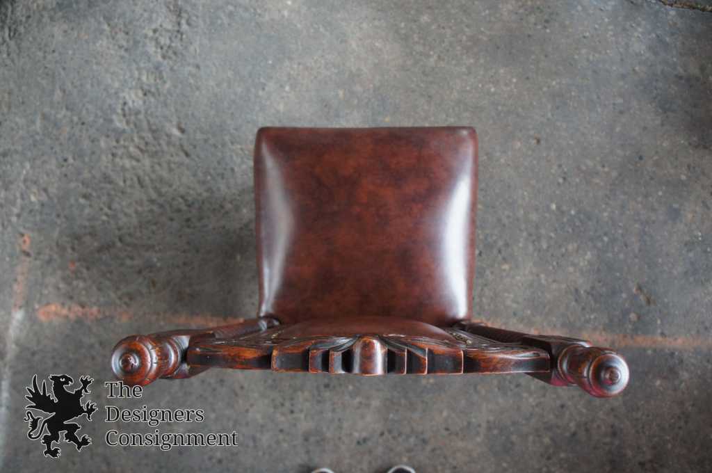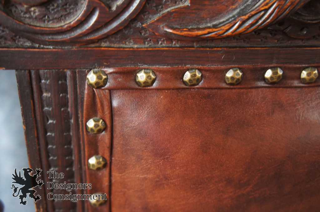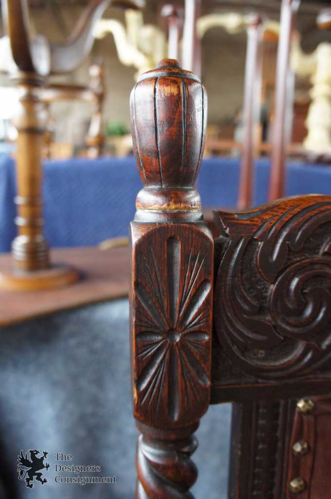 A beautiful set of four antique English dining chairs. Circa 19th Century. Made from oak with hand carved details. The chairs feature a split back with leather support and cushions between a turned barley twist design. This design continues down through the legs to intricately carved paw feet over casters. Along the back of each chair the North Wind Face can be seen fixed between finials. A design that became popular in England in the 18th and 19th century as whimsical furniture began to sweep through towns as it made its way across the Atlantic. The North Wind face is said to be seen whispering from the back of chairs as it blows wooden tendrils of wind from its mouth. The chair is supported through an H stretcher on the base. Leather back and seat are pinned with brass nail-head trim. An incredible set that will make for great conversation in any setting.