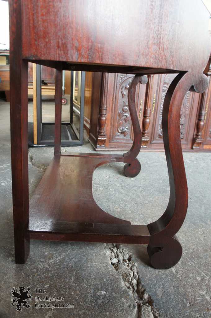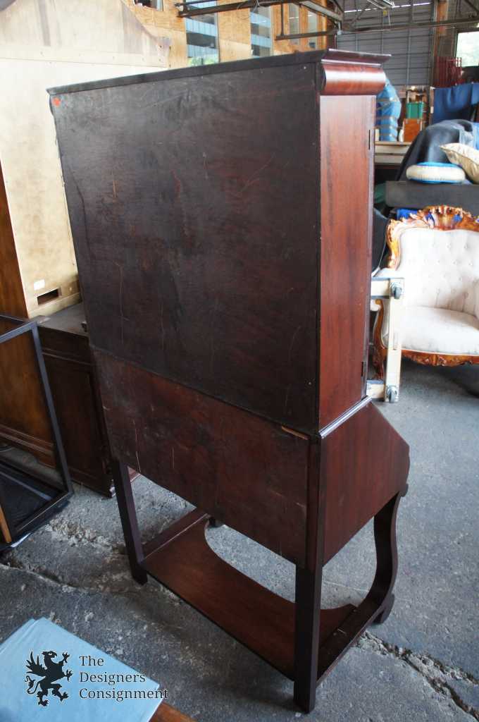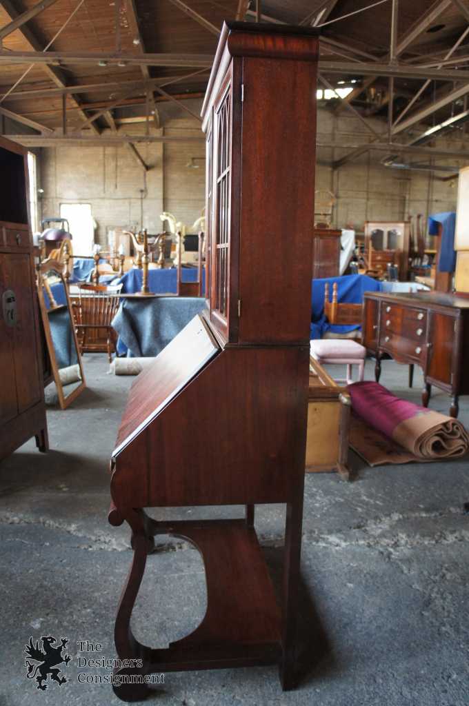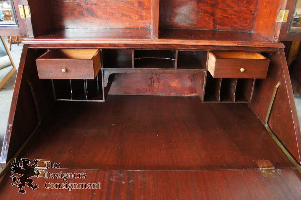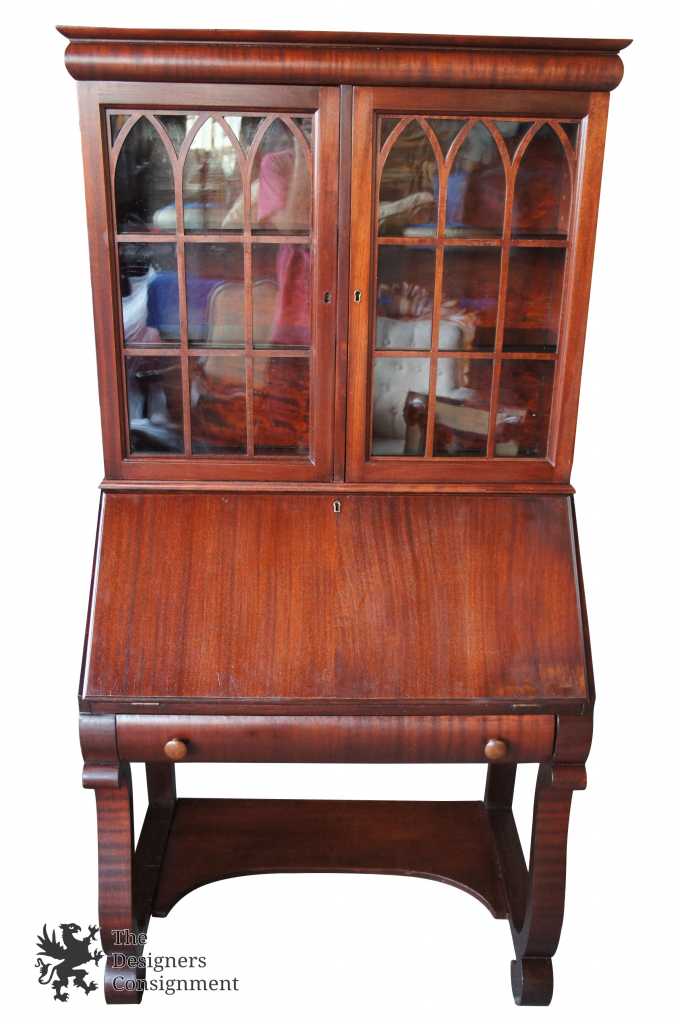 Early 20th century secretary with bookcase. Made from Mahogany in classic empire styling with a curved front and harp shaped legs. Bookcase shows a flare of Gothic styling with the fretwork along the doors. Interior has four adjustable shelves, drawers and letter compartments. A nice robustly sized cabinet that will make a statement in any setting.